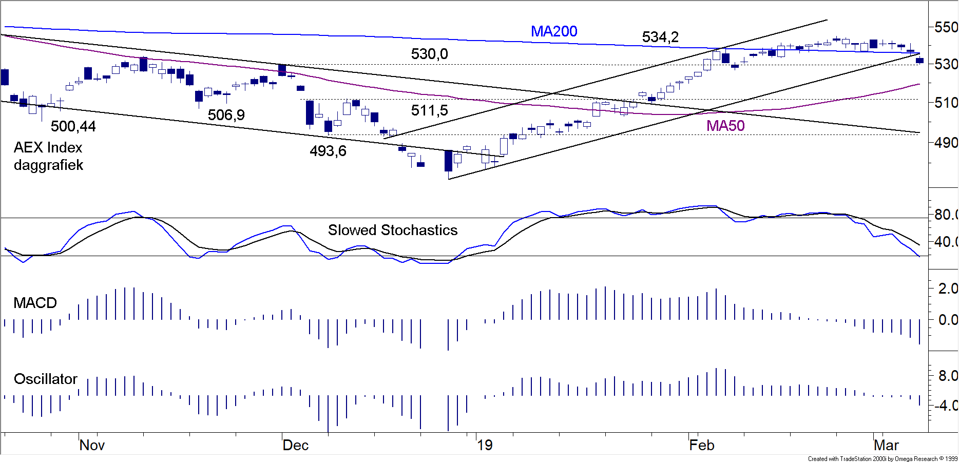 Ditmaal waren het niet Trump of BrexitHiermede wordt een exit van het Verenigd Koninkrijk uit de Euro aangeduid. Men noemt het ook wel Brixit. Copyright Vladeracken. Het was de reeds meer dan drie weken geleden aangekondigde reactieEen daling van de koersen met 5% of meer maar minder dan 10%. Copyright Vladeracken, die de markten omlaag bracht. Negatieve berichten inzake de wereldeconomie vormden de trigger. Inderdaad is deze reactieEen daling van de koersen met 5% of meer maar minder dan 10%. Copyright Vladeracken al langere tijd aangekondigd maar de markt bleef zich verzetten tot dan nu de kruik uiteindelijk brak. De korte termijn en ook de middellange termijn zijn daarmede omlaag gericht. Op de langere termijn is het vooral de S&P500 die het laat afweten. De Dow Jones Industrials IndexEen gemiddelde van de 30 meest verhandelde en grootste (industriële en financiële) aandelen van de beurs in New York en op de NasdaqNational Association of Securities Dealers Automated Quotations. De Amerikaanse nationale schermenbeurs. Copyright Vladeracken. Copyright Vladeracken en de AEX IndexEen gemiddelde van de 25 meest verhandelde en grootste aandelen van de Amsterdamse beurs. Opties op de AEX Index zijn van het Europese type. Copyright Vladeracken waren de eersten, die de reactieEen daling van de koersen met 5% of meer maar minder dan 10%. Copyright Vladeracken inzetten. Dat was op 25 februari. Zij daalden inmiddels met respectievelijk 3 % en 2,6%. Op 3 maart volgde de DAX IndexEen gemiddelde van de 30 meest verhandelde en grootste aandelen van de Duitse beurs. Copyright Vladeracken. Hij daalde sindsdien met 1,9% en was daarmede de beste onder de slechten. Op 4 maart volgde de S&P500 Index met een daling tot nu toe van 2,6% en de Nikkei Dow Index uit Tokyo sloot de rij met een verlies van 2,7% sinds 5 maart. Het is allemaal niet veel en een minidip is nog steeds mogelijk. Maar wij zien het als een begin. Want dit is nog niet afgelopen, ook al sloten de markten in Amerika afgelopen vrijdag met witte (maar lagere) candles. Bij de onderliggende sentimentDe emotionele gemoedstoestand van de gemiddelde belegger. Copyright Vladeracken indicatoren valt het op dat het VolumeOmzet. De hoeveelheid aandelen (in stuks) welke op een gegeven dag wordt verhandeld. Copyright Vladeracken relatief hoog ligt. Dit moet niet lang duren, want op zichzelf is dit een negatief teken als dat op negatieve dagen hoog is. Het is ook nog te vroeg om een uitspraak te doen over de tijd, die deze reactieEen daling van de koersen met 5% of meer maar minder dan 10%. Copyright Vladeracken gaat nemen. Doordat de indicatoren al langere tijd wezen op een aankomende reactieEen daling van de koersen met 5% of meer maar minder dan 10%. Copyright Vladeracken liggen ze op de daggrafieken al laag. Op alle weekgrafieken zijn nu de indicatoren ook dalende. Maar hier liggen ze nog hoog en zij wijzen er daarmede op dat deze reactieEen daling van de koersen met 5% of meer maar minder dan 10%. Copyright Vladeracken zijn tijd nog zal nemen. Als het aan de dag charts zou liggen dan zou het best mogelijk kunnen zijn dat er over zeg een week al een herstel volgt, maar dat is dan, gegeven de negatieve hoger gelegen charts, een herstel van korte duur en van geringe impact. De markten zijn hiermede op weg naar het dieptepunt van 26 december. Een doorbraak van de toen behaalde bodemDieptepunt in de koersontwikkeling. Men onderscheidt onder andere de dubbele, de triple, de broadening, de V en de extended bodem. Eén van de manieren om de aanwezigheid van een bodem vast te stellen is de volgende regel: iedere koers welke voorafgegaan wordt door drie hogere en gevolgd wordt door twee hogere slotkoersen, kan beschouwd worden als een bodem. Copyright Vladeracken zou ernstige gevolgen hebben, maar voorlopig durven wij te stellen dat het zo ver niet zal komen. Wij laten een en ander hieronder zien aan de hand van de daggrafiek van de AEX IndexEen gemiddelde van de 25 meest verhandelde en grootste aandelen van de Amsterdamse beurs. Opties op de AEX Index zijn van het Europese type. Copyright Vladeracken.