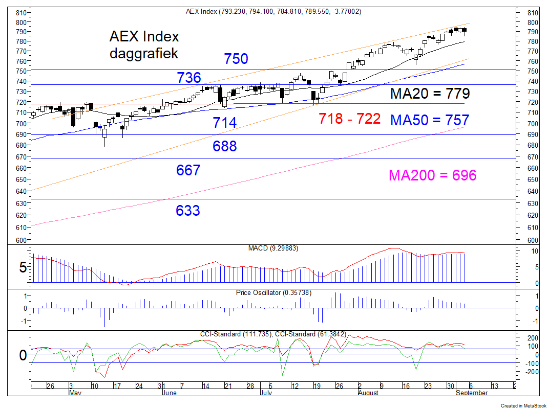 De bijeenkomst in Jackson Hole lijkt op het eerste gezicht met een sisser te zijn afgelopen. FED president Powell hield zich keurig staande op het dunne koord tussen de haviken, die een snel einde aan het opkoopprogramma (taperingGeleidelijke afbouw van de kwantitatieve verruiming in de Verenigde Staten. Copyright Vladeracken) wensen te zien en de duiven die taperingGeleidelijke afbouw van de kwantitatieve verruiming in de Verenigde Staten. Copyright Vladeracken nog enige tijd willen uitstellen. En de presidenten van andere centrale banken wereldwijd hielden zich gedeisd. Maar, zoals we in deze editie van de Technische BeleggerEen maandblad dat de ontwikkelingen op de wereldwijde effectenmarkten analyseert en becommentarieert uitgaande van de Technische AnalyseEen vorm van markt analyse die uitgaat van vraag en aanbod en handelsvolume, waarbij men met behulp charts en formules gebaseerd op marktgegevens probeert vast te stellen in welke fase van haar ontwikkeling de markt zich bevindt. Copyright Vladeracken. Het wordt uitgegeven door Vladeracken BV en wordt gratis aan haar klanten ter beschikking gesteld. Copyright Vladeracken zullen laten zien, onderliggend zijn er nogal wat trendveranderingen ingezet, die rechtstreeks samenhangen met Jackson Hole. Ondertussen blameerde het Westen zich afgelopen maand in Afghanistan (het beeld van mensen die van een opstijgend Amerikaans transporttoestel afvielen deed denken aan de helikopter, die van het dak van het CIA-kantoor in Saigon afviel, jaren geleden), lieten Nederlandse politici weer eens zien dat niet het landsbelang maar hun eigen belang de boventoon viert en leek de halve wereld in brand te staan of juist te overstromen. Maar deze zaken hebben nauwelijks invloed op de financiële markten. Wel belangrijk is de oprukkende besmettingsgraad in de VS, waar de Delta-variant van het Covid-19 virus nu flink huishoudt. Want nadat de rust in Jackson Hill was weergekeerd werd er afgelopen week erg slecht nieuws over de Amerikaanse arbeidsmarkt bekend. Er kwamen veel minder arbeidsplaatsen bij, dan waarop de meeste analisten hadden gerekend. De plus daarvan is dat “taperingGeleidelijke afbouw van de kwantitatieve verruiming in de Verenigde Staten. Copyright Vladeracken” waarschijnlijk niet al in oktober maar in november van start zal gaan in de VS, maar de min is, dat dit wijst op een vertraging in de Amerikaanse conjunctuurcyclus. De hoge vaccinatiegraad in het Westen leek aanvankelijk het einde van de economische malaise aan te kondigen, maar die vaccinatiegraad blijkt niet alleen niet hoog genoeg te zijn, hij is in feite alleen in Noord-West Europa relatief hoog. En de realiteit drong zich afgelopen weken op, dat de rest van de wereld bezig is met de volgende besmettingsgolf. Wie dan vervolgens alleen naar de AEX IndexEen gemiddelde van de 25 meest verhandelde en grootste aandelen van de Amsterdamse beurs. Opties op de AEX Index zijn van het Europese type. Copyright Vladeracken kijkt, kan zelfs de indruk krijgen, dat er niets aan de hand is. Want hier bereikten koersen opnieuw “All-Time highs”. Maar schijn bedriegt, zoals dat wel vaker is op beurzen, die, door emotie gedreven, almaar blijven oplopen.