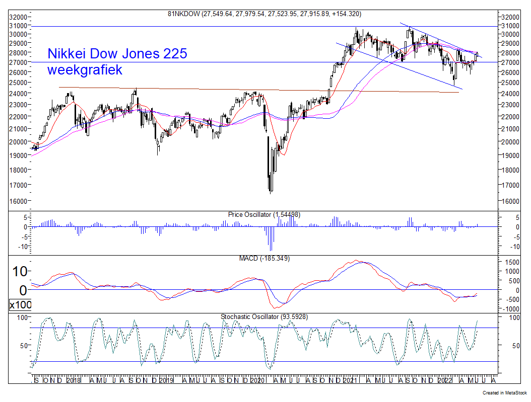 Ons optimisme wordt gestaafd door de ontwikkelingen in andere belangrijke aandelenmarkten. En de beste, dat wil zeggen de markt met het beste technische beeld, is de Japanse. In figuur 2 ziet u de weekgrafiek getekend van de Nikkei Dow Jones Index. De koers van deze index brak afgelopen week door de bovenste dalende trendlijn omhoog. Noch is daarmee de opgaande trendDe richting van de markt. Een opwaartse trend wordt gekarakteriseerd door een opeenvolging van hogere bodems en hogere toppen. Een neerwaartse trend wordt gekarakteriseerd door een opeenvolging van lagere bodems en lagere toppen.
