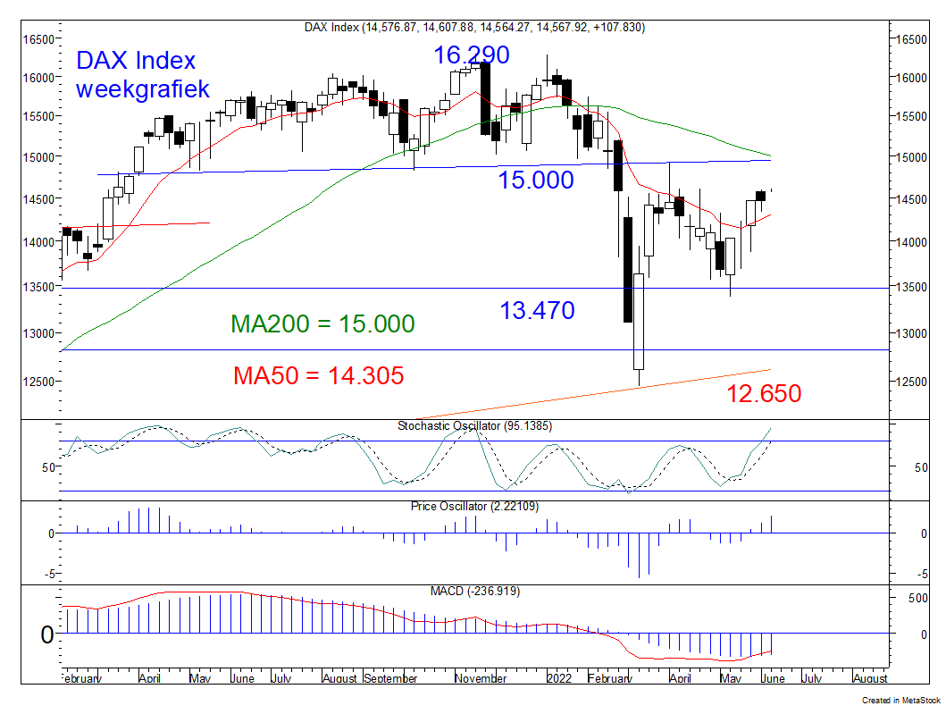 Copyright Vladeracken op 15.000 punten. De indicatoren onder in de figuur laten genoeg ruimte over voor een beweging die niet alleen naar die lijn toegaat, maar er op korte termijn ook doorheen breekt. Daarna is een pullback nodig, om de kracht van de 15.000-punten lijn te testen, maar er is op dit moment geen reden om te twijfelen aan dit per saldo optimistische scenario.