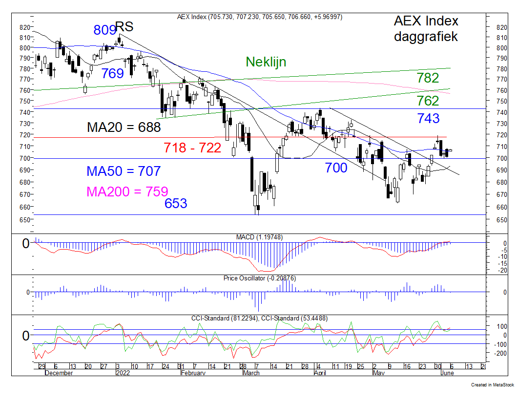 Copyright Vladeracken op 743 punten (de blauwe horizontale lijn midden door de koersgrafiek), maar wij achten de kans groot, dat de AEX IndexEen gemiddelde van de 25 meest verhandelde en grootste aandelen van de Amsterdamse beurs. Opties op de AEX Index zijn van het Europese type.