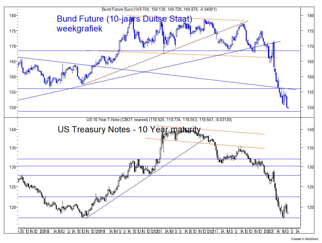 In onze vorige editie uitten wij de verwachting, dat de maand mei in het teken zou staan van een wereldwijde kentering (op de financiële markten). En het doet ons een groot genoegen om de editie van vandaag van onze Technische BeleggerEen maandblad dat de ontwikkelingen op de wereldwijde effectenmarkten analyseert en becommentarieert uitgaande van de Technische AnalyseEen vorm van markt analyse die uitgaat van vraag en aanbod en handelsvolume, waarbij men met behulp charts en formules gebaseerd op marktgegevens probeert vast te stellen in welke fase van haar ontwikkeling de markt zich bevindt. Copyright Vladeracken. Het wordt uitgegeven door Vladeracken BV en wordt gratis aan haar klanten ter beschikking gesteld. Copyright Vladeracken te mogen openen met de bevestiging dat de kentering een feit is. Overal staan kranten vol van berichten over de enorme inflatie, die zich momenteel voordoet, mede als gevolg van de logistieke problemen door de Covid-lockdowns in China en de oorlog in Oekraïne. Maar de feiten worden momenteel door de financiële markten anders geïnterpreteerd. Meer en meer wordt duidelijk, dat de wereld zich in een recessie bevindt. Natuurlijk, een recessie wordt pas erkend wanneer zich twee kwartalen van krimp hebben voorgedaan. Een beetje als het dempen van de put als het kalf verdronken is, iets waar veel beleidsmakers en politici uitermate kundig zijn, met name wanneer zij zich erop voor laten staan dat zij als leiders van een land geen visie nodig hebben (onze eigen premier is hier bijzonder goed in, in het niet hebben van visie). Maar allerlei statistische data wijzen erop, dat begin juli, die recessie daadwerkelijk geconstateerd kan gaan worden voor onder meer de VS. Een recessie betekent minder vraag naar goederen en dus dalende prijzen. Dat leidt er vervolgens toe, dat centrale banken (en dan niet in de laatste plaats die van de VS, de FED), het rentebeleid willen versoepelen. Maar markten gaan nog uit van een flinke verkrapping dit jaar. Op de obligatiemarkten is de lange rente vooruitgelopen op deze verkrapping. Duitsland betaalt inmiddels 1% rente op 10-jarige staatsleningen waar dat een klein jaar geleden minus 0,6% was, een kentering van meer dan 1,5%! In de VS wordt uitgegaan van een serie renteverhogingen, die dit jaar nog de korte rente tot 3% zal doen oplopen (nu 0,5%). En de koersdalingen in met name de groei-gerelateerde “big-tech”-aandelen zijn hiervan het rechtstreekse gevolg. Afgelopen week kwam daar nog meer slecht nieuws overheen toen duidelijk werd, dat ook het advertentievolume in de VS terugloopt, de levensader van veel van deze grote technologieondernemingen. Maar ondertussen vertonen de koerspatronen van juist deze big-tech aandelen meer en meer bodemachtige kenmerken. De koersen dalen niet wezenlijk meer ondanks al dit slechte nieuws. En stel nu eens, dat de rente in de VS en in Europa minder sterk verhoogd wordt dit jaar dan iedereen op dit moment bevroedt? Dan is een opluchtingsrally in de aandelenmarkten in het Westen een hele logische volgende stap. En dat is dus ook precies waar wij nu vanuit gaan. De maand juni is goed begonnen en zou wel eens de beste van 2022 tot nog toe kunnen worden.