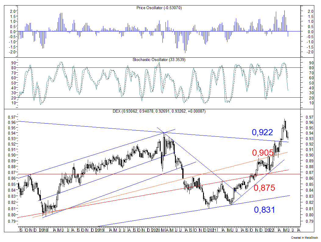 Uiteindelijk bereikte de $-koers precies het hoogtepunt dat in de periode 2015 – 2016 ook al eens als keerpunt diende op 0,967. Vervolgens zette de $ ten opzichte van de € de weg omlaag weer in. Daarmee is het nog altijd niet duidelijk of de $ nu werkelijk richting pari zal oplopen of niet en daarmee wel of niet een lange termijn stijgende trendDe richting van de markt. Een opwaartse trend wordt gekarakteriseerd door een opeenvolging van hogere bodems en hogere toppen. Een neerwaartse trend wordt gekarakteriseerd door een opeenvolging van lagere bodems en lagere toppen. Copyright Vladeracken ingegaan zal zijn. De reactieEen daling van de koersen met 5% of meer maar minder dan 10%. Copyright Vladeracken na het bereiken van deze top kan voorlopig nog als een pullback gezien worden, terug naar de lange termijn dalende trendDe richting van de markt. Een opwaartse trend wordt gekarakteriseerd door een opeenvolging van hogere bodems en hogere toppen. Een neerwaartse trend wordt gekarakteriseerd door een opeenvolging van lagere bodems en lagere toppen. Copyright Vladeracken. Maar de maandcandle van juni is vooralsnog (hij is pas 5 dagen oud) zeer negatief. Wij kunnen daarom over de $ op dit moment niets anders zeggen dan dat de $ fundamenteel gesproken veel te duur is ten opzichte van de €, maar dat technisch gezien er geen helder beeld is over de richting die de $ in de komende maand zal inslaan. Feit is, dat de Hamburger Index een $-koers van 1,30 ten opzichte van de € voorstaat (nu 1,07) en dat het verschil tussen de Amerikaanse en de Europese begrotingsdiscipline in fundamentele zin een structureel zwakkere $ voorstaat ten opzichte van de €.