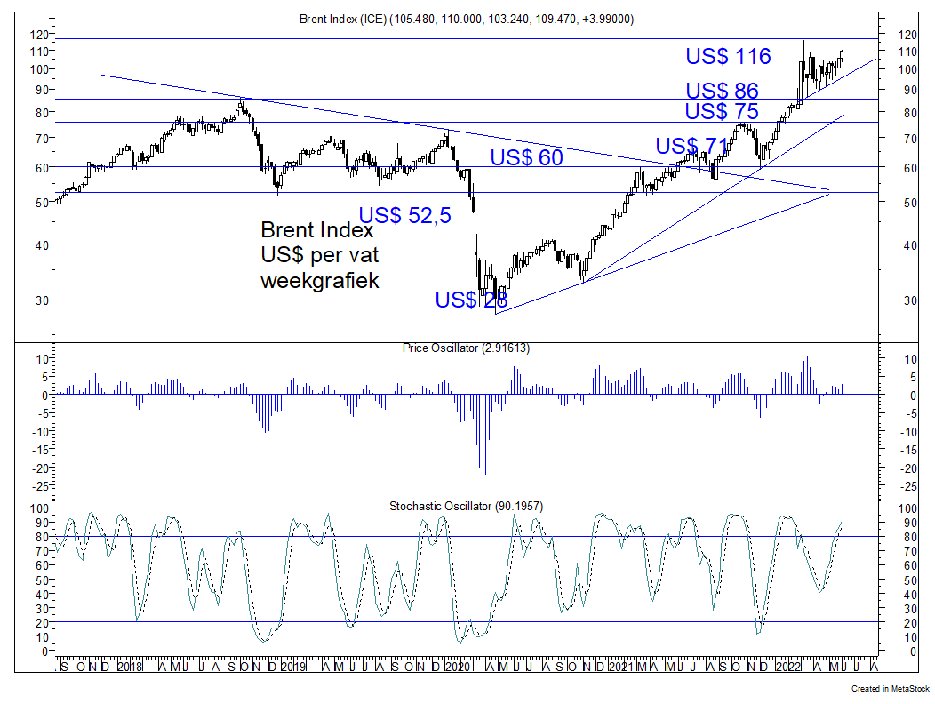 De prijs van een vat Brentolie is onderweg naar de top van US$116 per vat die eerder dit jaar al een keer gezien werd. Het is goed mogelijk, dat die top geraakt wordt of zelfs iets overschreden wordt. Maar er is een veel forsere stijging nodig om te voorkomen, dat de indicatoren in de weekgrafiek negatief gaan divergeren. En daarmee concluderen wij dat de huidige koersstijging slechts een stuiptrekking is in een fase van topvorming die al enkele maanden aan de gang is. Het beeld in figuur 7 ondersteunt onze verwachting dat het met de inflatie in de wereld gaat meevallen. Ook het technische beeld bij de prijsontwikkeling voor “natural gas” (aardgas) ondersteunt het beeld dat wij al langer schetsen, namelijk dat van topvorming in de markt voor fossiele brandstoffen.