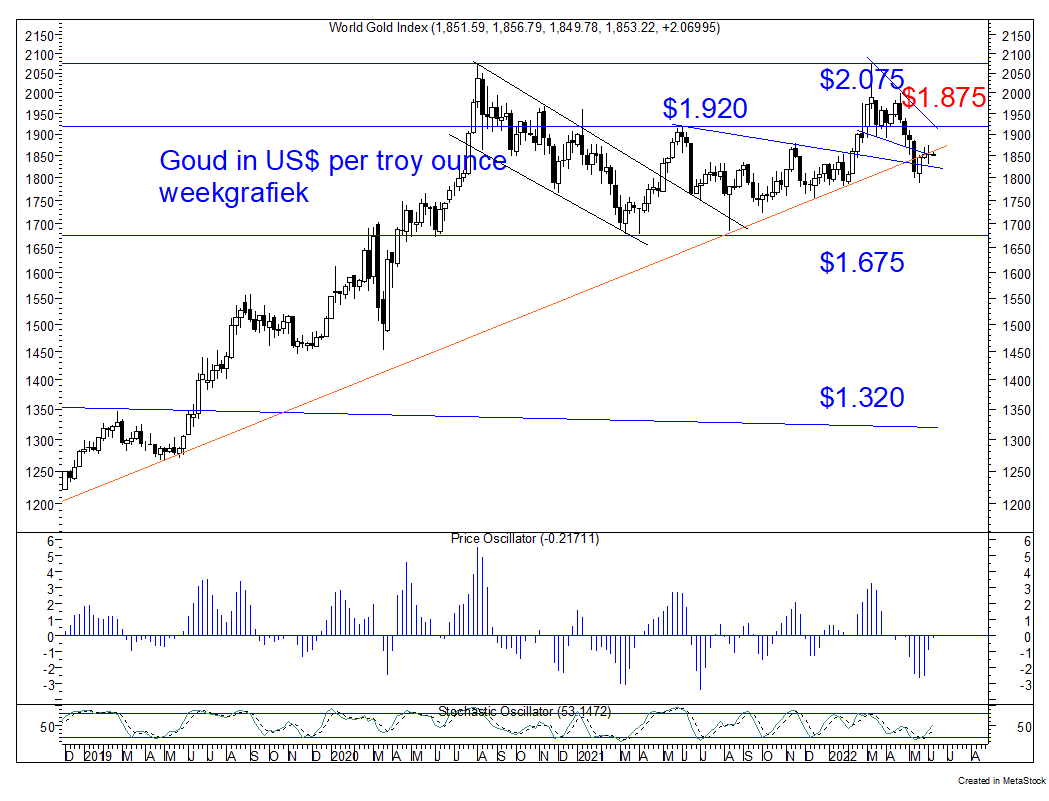 Het gevaarlijkste beeld van dit moment hebben wij voor het laatst bewaard. En dat is het beeld in figuur 8. De koers van een troy ounce goud is door de rode lange termijn oplopende trendlijn in de figuur gezakt en lijkt zich afgelopen weken weliswaar te hebben hersteld, maar dan vooral van onderaf tot aan die lijn hetgeen betekent dat hier waarschijnlijk sprake is van een pullback naar die trendDe richting van de markt. Een opwaartse trend wordt gekarakteriseerd door een opeenvolging van hogere bodems en hogere toppen. Een neerwaartse trend wordt gekarakteriseerd door een opeenvolging van lagere bodems en lagere toppen.