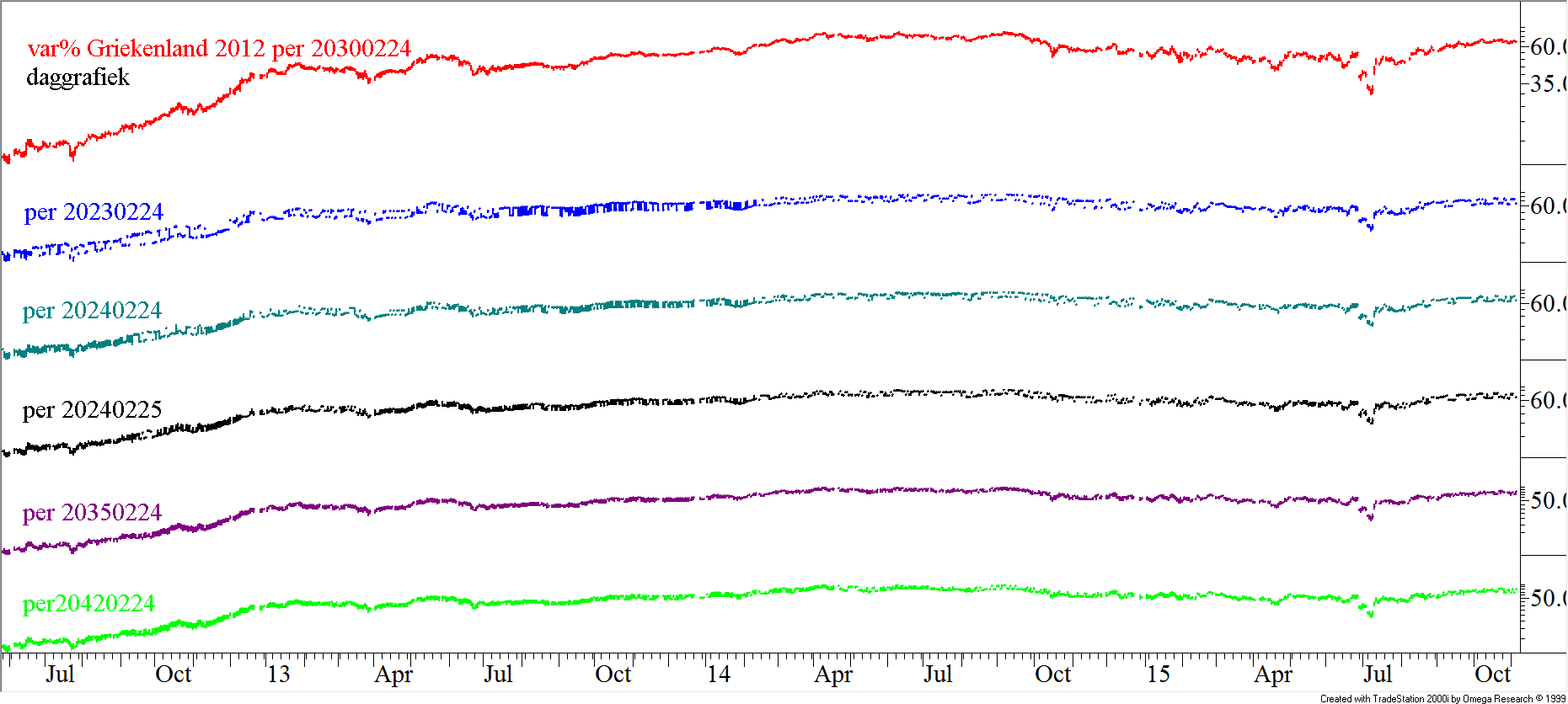 Wat bij ons onderzoek ook bleek is dat de biedingen in de markt van dag op dag flink kunnen verschillen. U ziet dat in de grafiek ook, daar is de dagelijkse bandbreedte vrij ruim. Het is dus zaak om met enige voorzichtigheid te werken, maar de belegger moet zich ook realiseren dat aankopen van deze obligaties één ding is, later dezelfde stukken weer verkopen kan onmogelijk blijken. Als u al overweegt om deze obligaties te kopen, doe dat dan wel met het idee om ze te houden tot aan de aflosdatum en besef dan dat 2023 nog ruim 7 jaar verder is. Dat maakt deze leningen tot obligaties met een looptijd, die langer is dan het marktgemiddelde. De leningen zijn daarom ook nog eens rentegevoelig. Als de rente gaat stijgen en de risicopremieExtra rendementDe uiteindelijke opbrengst van een belegging. Bij aandelen bestaat het uit het dividend vermeerderd of verminderd met het koers-resultaat. Copyright Vladeracken op een obligatieEen schuldbekentenis aan toonder voor een bepaald bedrag (nominale waarde) met een van tevoren vastgestelde rentevergoeding en met een terugbetalingconditie van de hoofdsom op een van tevoren vastgesteld tijdstip. Copyright Vladeracken of een aandeel omdat het risicoDit wordt wel berekend als het product van de standaarddeviatie van de waardeontwikkeling van een portefeuille (aandeel) en de mutatiegraad op jaarbasis binnen deze portefeuille (van dit aandeel). Copyright Vladeracken groter wordt geacht dan normaal. Copyright Vladeracken van Griekenland daalt ondertussen niet verder, dan kan de koers flink onderuit gaan.