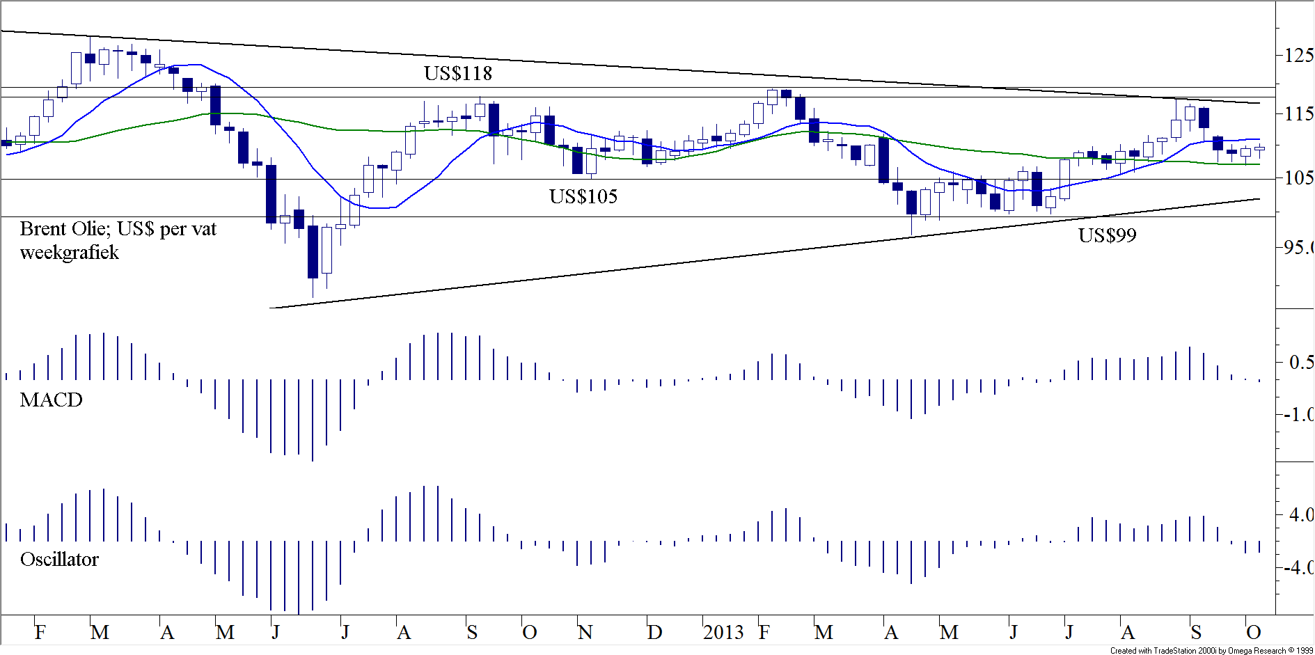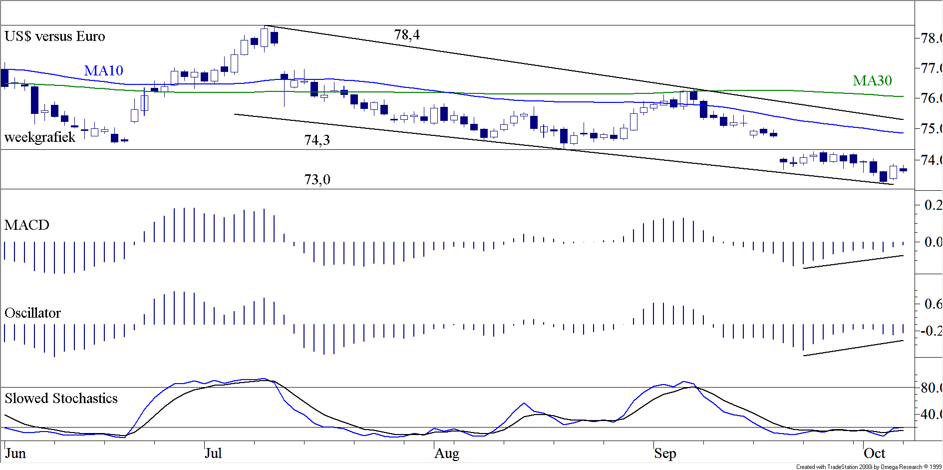 De dollar is op weg naar de onderkant van een horizontaal kanaal waarin hij zich bevindt sinds september 2012. Deze onderkant ligt op 73,0. Zijn laagste koers afgelopen week was 73,28. Het ziet ernaar uit dat de steun op 73,0 het (voorlopig) gaat houden. Wij laten u daartoe het verloop van de prijs van de dollar uitgedrukt in Euro’s zien op dagbasis in figuur 5. Het beeld is zonder meer droevig en er zal zeer veel goed nieuws moeten komen van over de oceaan wil dit wezenlijk verbeteren. Maar op dit moment wordt er positief gedivergeerd en zijn de indicatoren stijgende. Dit alles lijkt erop te wijzen dat de markt van mening is dat het Amerikaanse budget 2014 en het hogere schuldenplafond binnen afzienbare tijd door het Congres zullen worden goedgekeurd. Wat er daarna zal gebeuren ligt nog in de mist van de toekomst verborgen want de hogere timeframes zijn nog steeds duidelijk negatief. Het zal ervan afhangen hoe sterk de korte termijn zal verbeteren of deze timeframes de richting naar boven kunnen inslaan.