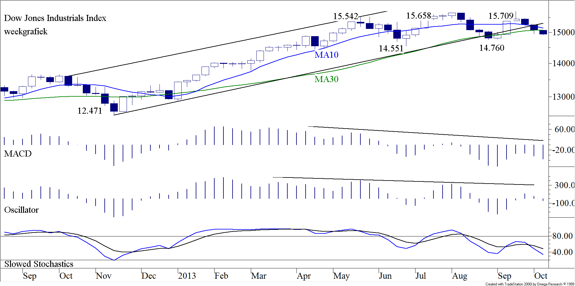Copyright Vladeracken daaronder divergeert ook negatief en hij daalt ook. Het beeld dat figuur 2 laat zien is met dit alles negatief en een doorbraak door het MA30 lijkt onafwendbaar. Maar de ruimte is niet groot meer. Een daling tot 14.760 zal geen negatieve gevolgen oproepen maar een doorbraak door dat niveau zal een driedubbele top bevestigen en dan moet men rekening houden met de mogelijkheid van nog eens een daling met 1.000 punten. Als dat zou gebeuren voldoet de weekgrafiek niet meer aan de eisen van een stijgende trendDe richting van de markt. Een opwaartse trend wordt gekarakteriseerd door een opeenvolging van hogere bodems en hogere toppen. Een neerwaartse trend wordt gekarakteriseerd door een opeenvolging van lagere bodems en lagere toppen.