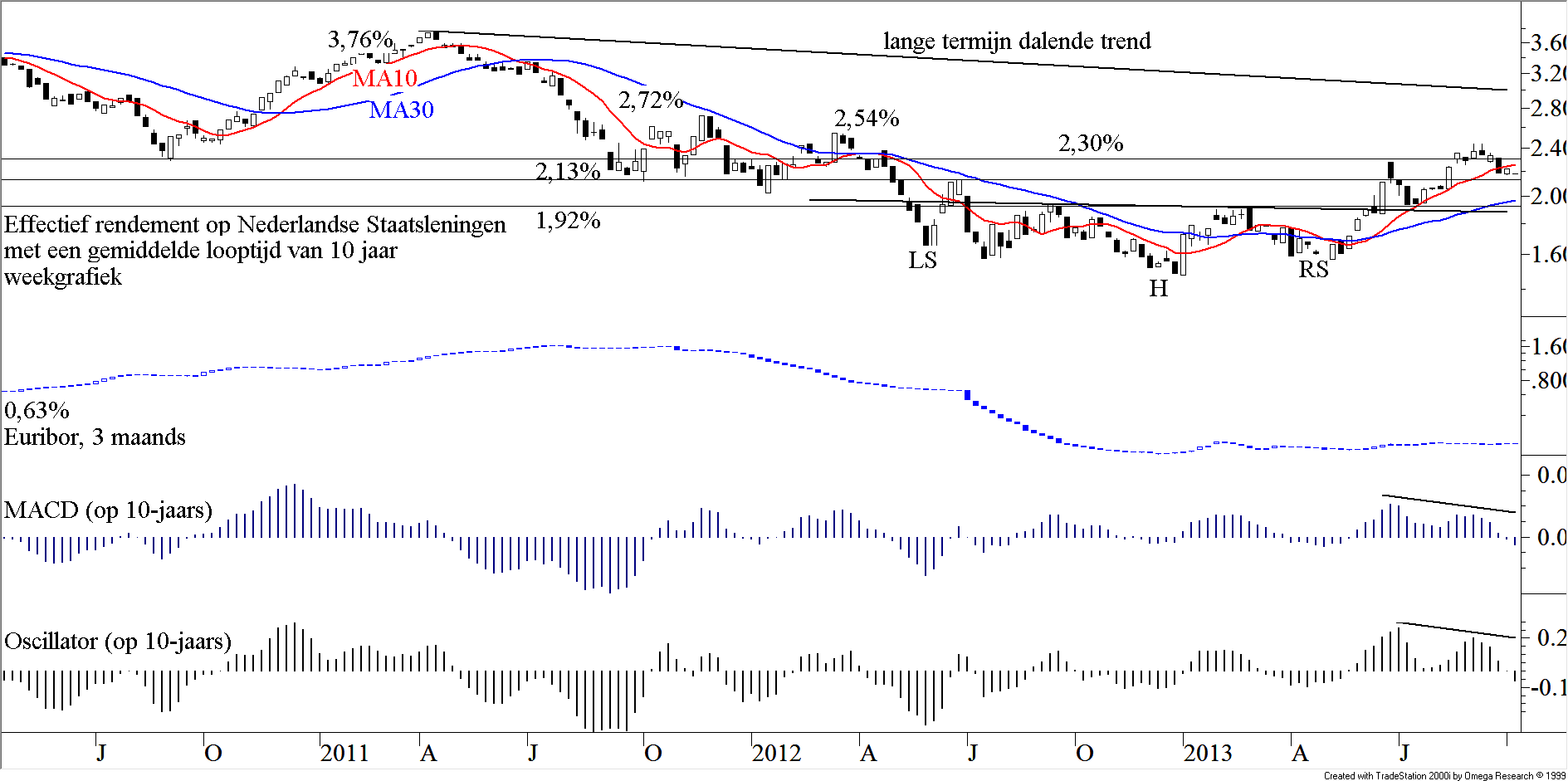Figuur 4 laat het verloop van het effectieve rendementDe uiteindelijke opbrengst van een belegging. Bij aandelen bestaat het uit het dividend vermeerderd of verminderd met het koers-resultaat. Copyright Vladeracken op 10-jarige Nederlandse Staatsleningen zien. Het is een weekgrafiek. De afgelopen week liet een licht herstel van dit rendementDe uiteindelijke opbrengst van een belegging. Bij aandelen bestaat het uit het dividend vermeerderd of verminderd met het koers-resultaat. Copyright Vladeracken zien. Dit herstel hoeft nog niet afgelopen te zijn want de daggrafiek ziet er redelijk positief uit. Maar op iets langere termijn moet er rekening mee gehouden worden, dat de rente verder zal gaan dalen. Met een negatieve divergentieWanneer twee of meer gemiddelden, indexen of indicatoren nalaten elkaar de confirmeren. Copyright Vladeracken en een dalende Momentum AnalyseEen combinatie van twee momentumAlgemene term die gebruikt wordt om de snelheid van bepaalde koersbewegingen weer te geven. Het momentum meet de prijsverandering van een aandeel of index in een bepaalde periode en kan in absolute zin of als ratio worden weergegeven. Het is een oversold/overbouhgt indicator. In vergelijking met de FracMom is de Mom in het algemeen sneller in het tonen van divergentie bij bodems. Het wordt berekend door de koers van x dagen geleden af te trekken van de koers van heden. Copyright Vladeracken indicatoren (Oscillator Het verschil tussen een kortere termijn gemiddelde van een koers met dat van een langere termijn gemiddelde van dezelfde koers. Copyright Vladerackenen MacdMoving Average Convergence Divergence van Gerald Appel. Het verschil tussen een kortere termijn koers gemiddelde en een langere termijn koersgemiddelde, waarbij de beide gemiddelden berekend zijn volgens de exponentiële methode, dit in afwijking van de meer gebruikelijke rekenkundige methode. In vergelijking met de FracMACD is de MACD in het algemeen sneller in het tonen van divergentie bij bodems. De kruising van beide lijnen, de kruising met de nullijn en de divergentie kunnen signalen geven. Copyright Vladeracken) die tezamen scherper functioneren dan ieder afzonderlijk. Copyright Vladeracken kan men niet verwachten dat de eerder ingezette daling niet vervolgd zal worden.