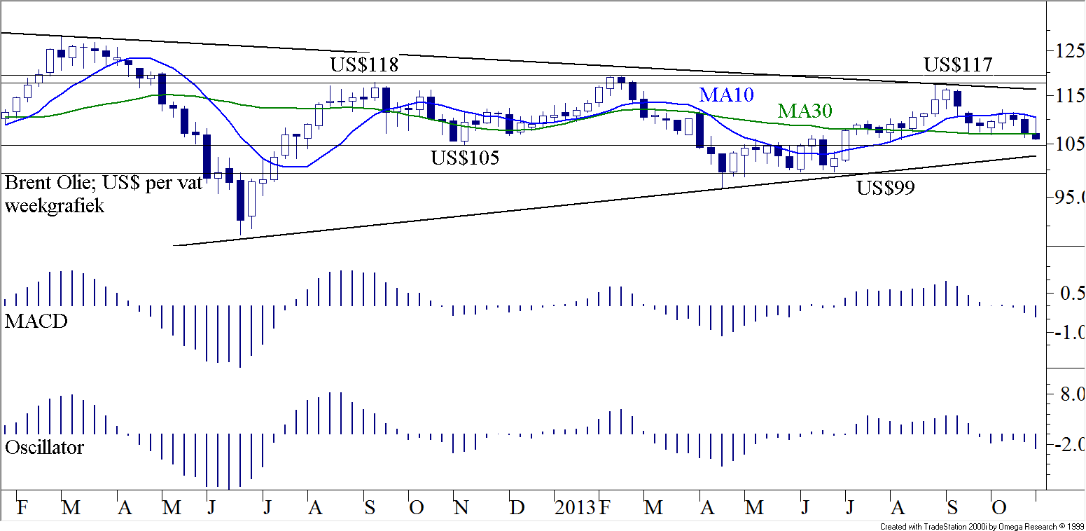 De koers van een vat Brentolie begint zich in wat het best valt te omschrijven als de “doldrums”. Dat is een bij zeezeilers berucht gebied op de oceanen waar gedurende langere periodes geen wind is. Wie daarin terecht komt kan weken lang blijven ronddobberen zonder richting. En dat is precies wat de olieprijzen nu al weer bijna twee jaar aan het doen zijn. Het patroon in de figuur is een langgerekte taps toelopende evenwijdige driehoek. Maar als een koers te ver in de punt van de driehoek terecht komt moet elke uitbraakEen koerssprong, die optreedt als een aandeel een bepaald koerspatroon verlaat of een belangrijke trendlijn doorbreekt.