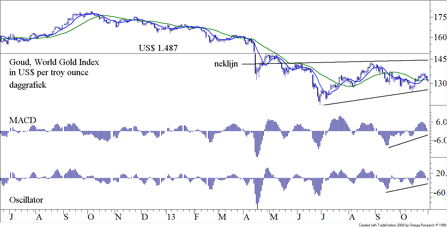De $-koers van het goud is bezig met een groot correctiepatroon. Een maand geleden schreven wij dat wij nog uitgingen van een kopschouderbodem. Maar de reactieEen daling van de koersen met 5% of meer maar minder dan 10%. Copyright Vladeracken omlaag van afgelopen week maakt dat het patroon te lang begint te duren om nog een kopschouderbodem te kunnen zijn. Dat er sprake kan zijn van een bodempatroon blijft echter wel overeind. Wij hebben er nu een enigszins oplopende driehoek van gemaakt. Daarin is de koers nu naar de onderkant op weg. Maar er is sprake van duidelijke positieve divergentieEen situatie waarbij een koersbeweging van een aandeel of van een index niet bevestigd wordt door het koersverloop van een indicator of van een andere index. Het is een vroege indicatie voor een mogelijke trendomkeer. Copyright Vladeracken in de indicatoren onder in de figuur. Vermoedelijk zal de huidige reactieEen daling van de koersen met 5% of meer maar minder dan 10%. Copyright Vladeracken maar van korte duur zijn en kan de koers daarna weer de weg omhoog richting de neklijnSteun of weerstandsniveau onder andere in een Kop & Schouder patroon. De neklijn verbindt de toppen of bodems van het patroon afhankelijk van het feit of het een top- of bodemformatie is. Copyright Vladeracken aan de bovenkant van het patroon hervatten. Als onverwacht toch de oplopende steunlijn (die nu rond US$1.265 ligt) gebroken wordt, dan nog is er geen reden tot paniek omdat daaronder nog verschillende steunniveaus liggen. Maar wij gaan uit van een positiever scenario: de steun van US$1.265 houdt het en de koers gaat een poging wagen om de bovenkant van de figuur (nu op US$1.485) te breken.