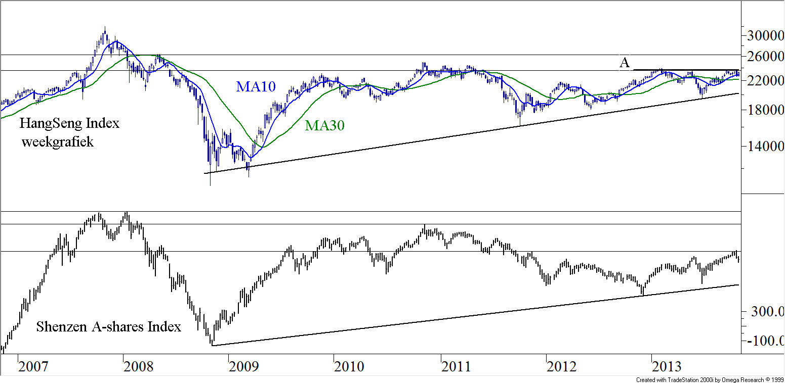 De Amerikaanse en Europese beurzen lopen op het ogenblik voor op veel andere beurzen. Beurzen in het Verre Oosten, maar ook in Zuid Amerika blijven achter. Ter illustratie hebben wij in figuur 3 de weekgrafiek opgenomen van de HangSeng Index (Hongkong) en de Shenzen A-shares Index (Shenzen Zone in China). Waar wij in Nederland (maar ook in andere Europese landen) de top uit 2010 / 2011 inmiddels hebben gebroken is dat hier nog niet het geval. Maar bovendien is hier de weg omlaag opnieuw ingeslagen. Het is niet zo dat de trendDe richting van de markt. Een opwaartse trend wordt gekarakteriseerd door een opeenvolging van hogere bodems en hogere toppen. Een neerwaartse trend wordt gekarakteriseerd door een opeenvolging van lagere bodems en lagere toppen.