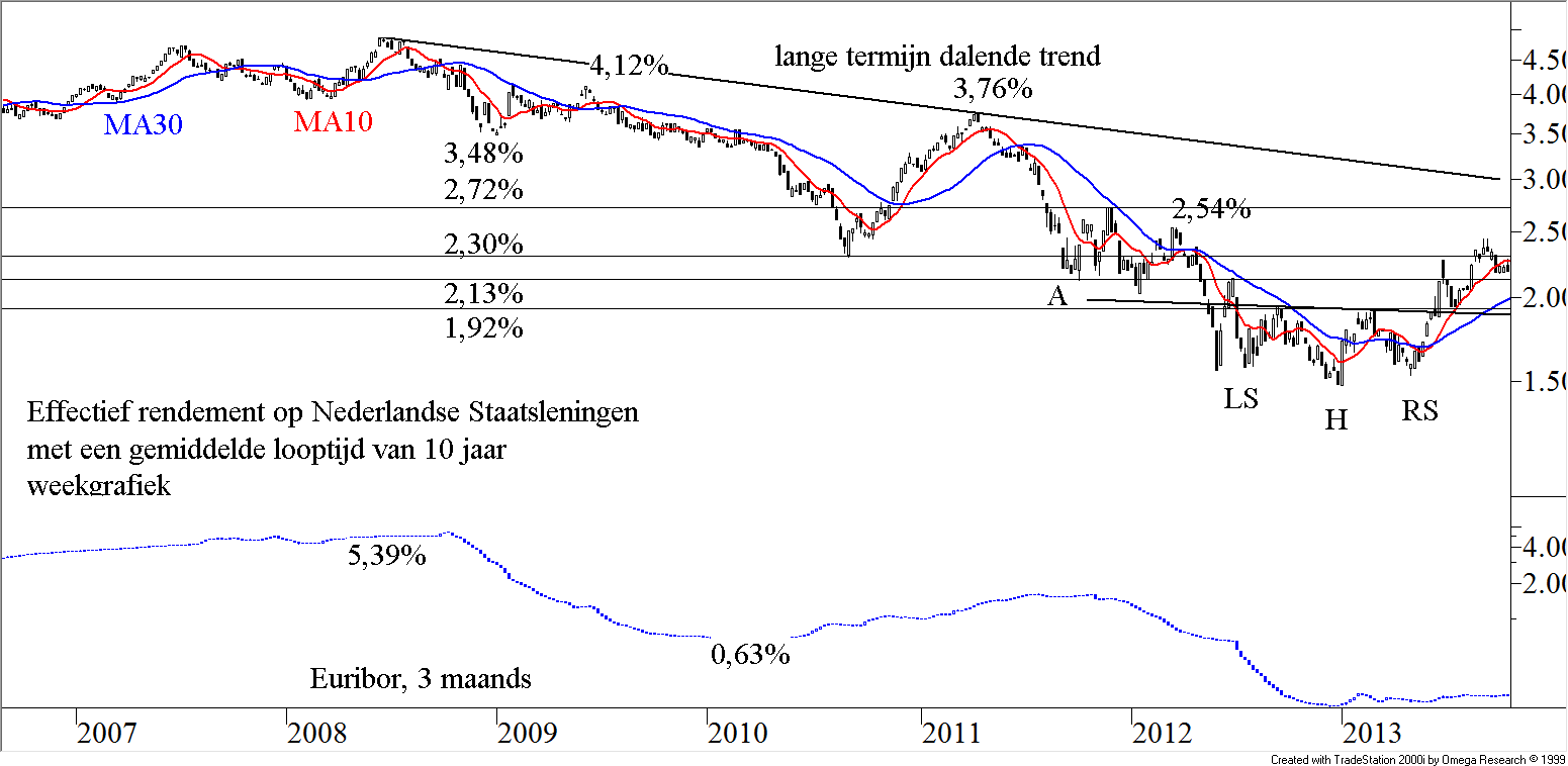 Copyright Vladeracken op 10-jarige Nederlandse Staatsleningen is afgelopen maand gedaald, flink gedaald zelfs. In figuur 4 is deze rente getekend met daaronder de 3-maands Euribor. Maar u ziet daarin direct ook dat er in feite aan het beeld niets is veranderd. De rente is bezig terug te keren naar het punt van uitbraakEen koerssprong, die optreedt als een aandeel een bepaald koerspatroon verlaat of een belangrijke trendlijn doorbreekt.