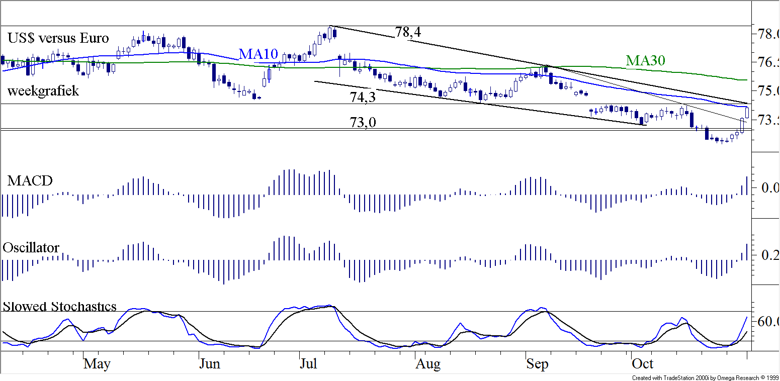 De koers van de $ steeg in twee weken tijd met een kracht die al lang niet meer is gezien. Er is nog een klein beetje ruimte aan de bovenkant, maar op 74,3 ligt een belangrijke weerstandKoersniveau waaronder koersen de neiging hebben om na een stijging te stabiliseren.
