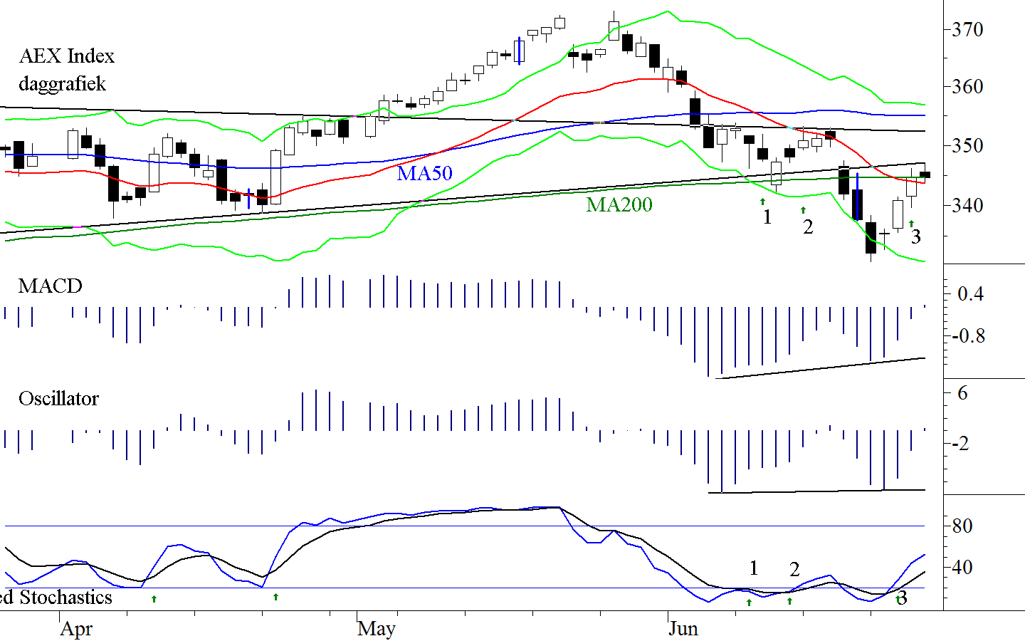 In figuur 2 laten wij u het verloop van de AEX IndexEen gemiddelde van de 25 meest verhandelde en grootste aandelen van de Amsterdamse beurs. Opties op de AEX Index zijn van het Europese type. Copyright Vladeracken op dagbasis zien. Wij hebben er opnieuw het handelssysteem ingezet, dat wij u reeds enkele malen eerder lieten zien. Wij wijzen u in eerste instantie op de cijfers in de grafiek. Bij 1 werd een eerste koopsignaal gegeven. Het is welbekend dat een eerste signaal vaak gevolgd wordt door een tweede dat op een lager niveau ligt (wij laten het eerste signaal daarom altijd links liggen). Het tweede signaal (bij 2) werd al vier dagen later gegeven. De belegger die toen ingestapt is, was nog steeds te vroeg, want de daling ging door. Maar afgelopen woensdag verscheen het (niet vaak voorkomende) derde signaal. Alhoewel 100% in de Technische AnalyseEen vorm van markt analyse die uitgaat van vraag en aanbod en handelsvolume, waarbij men met behulp charts en formules gebaseerd op marktgegevens probeert vast te stellen in welke fase van haar ontwikkeling de markt zich bevindt. Copyright Vladeracken niet voorkomt moet dit derde signaal toch als zeer solide gezien worden. U ziet bijvoorbeeld, dat alle indicatoren in de figuur positief divergeren. Maar volgens de hogere bodems/hogere toppen theorie zit de AEX IndexEen gemiddelde van de 25 meest verhandelde en grootste aandelen van de Amsterdamse beurs. Opties op de AEX Index zijn van het Europese type. Copyright Vladeracken op dagbasis in een baisseEen term die gebruikt wordt voor een beurs waarop over een breed front de koersen dalen. Copyright Vladeracken. Pas wanneer het niveau 352,99 wordt gebroken komt dit negatieve beeld in een ander daglicht te staan. Als dit gebeurt dan is inmiddels het midden van de Keltnerchannel gebroken maar er wordt dan ook een Adam bodemDieptepunt in de koersontwikkeling. Men onderscheidt onder andere de dubbele, de triple, de broadening, de V en de extended bodem. Eén van de manieren om de aanwezigheid van een bodem vast te stellen is de volgende regel: iedere koers welke voorafgegaan wordt door drie hogere en gevolgd wordt door twee hogere slotkoersen, kan beschouwd worden als een bodem. Copyright Vladeracken afgesloten. Patronen lenen zich tot het berekenen van doelstellingen en in dit geval kan de doelstelling berekend worden op 376. U zult zich herinneren dat de vorige top op 373 ligt. Dat de top op 373 genomen zal worden valt nog te bezien, want u hebt het goede nieuws nu toch wel ongeveer gehad.