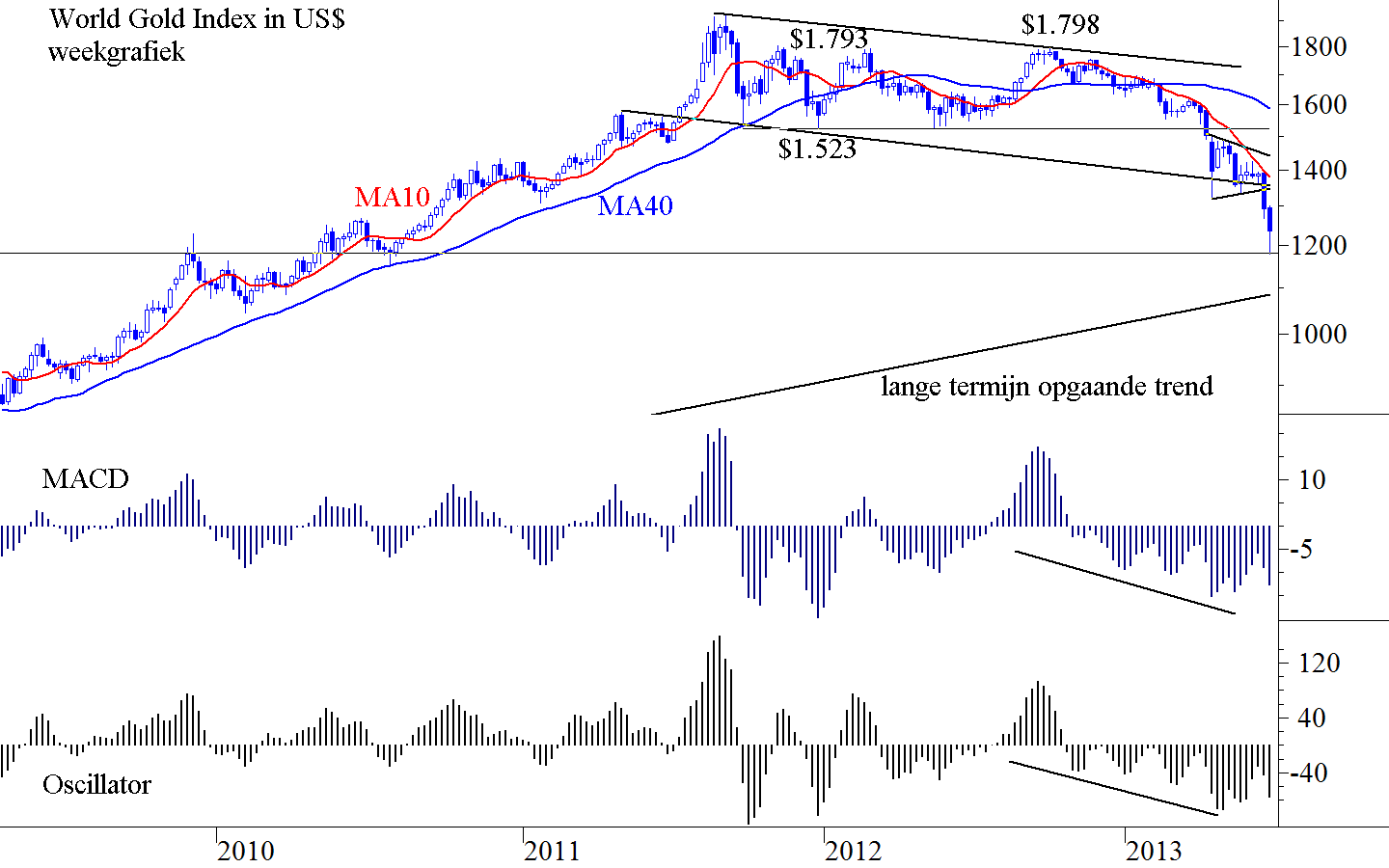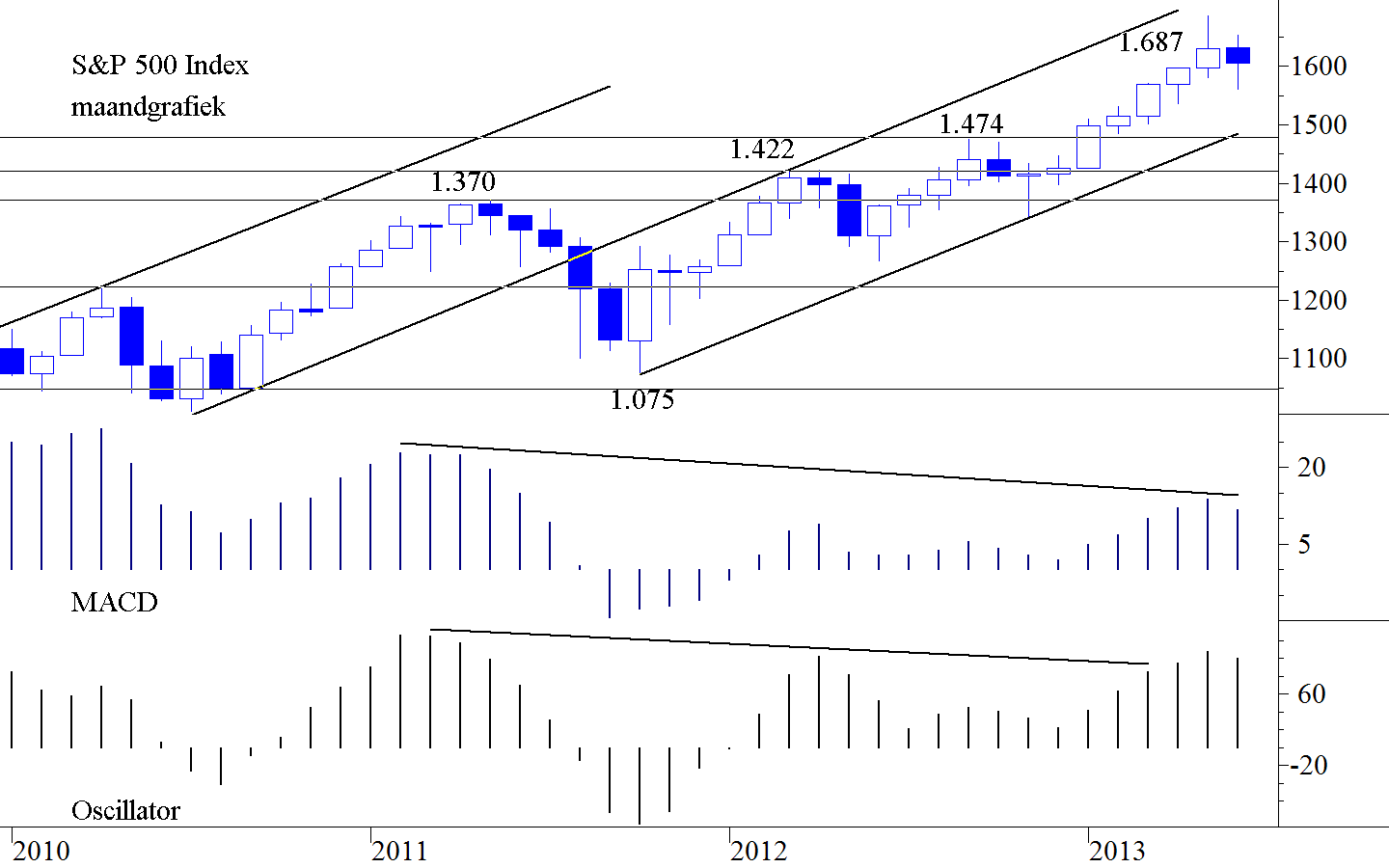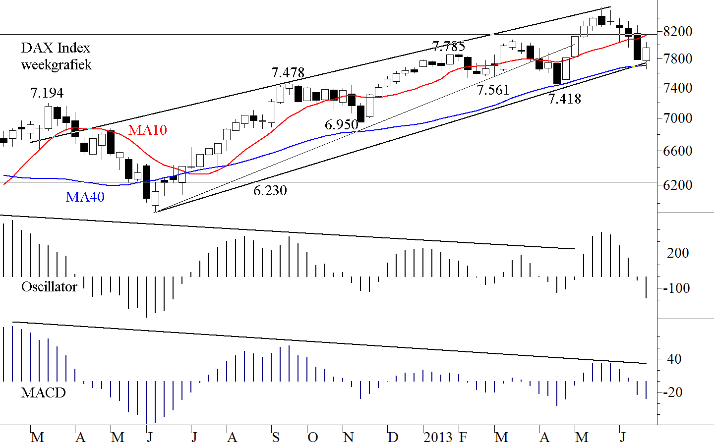 De weekgrafieken zien er op geen enkele markt mooi uit. De indicatoren dalen en zij divergeren negatief. Ter illustratie nemen wij de weekgrafiek van de DAX op in figuur 3. De koers bevindt zich in een stijgend kanaal. De hausse is nog steeds intact. Toen de bovenkant geraakt werd zette de daling in en nu ligt de DAX op de onderkant van het kanaal. Van deze onderkant krijgt hij steun. Steun gaat er ook uit van het MA40 dat op gelijke hoogte ligt. De MACDMoving Average Convergence Divergence van Gerald Appel. Het verschil tussen een kortere termijn koers gemiddelde en een langere termijn koersgemiddelde, waarbij de beide gemiddelden berekend zijn volgens de exponentiële methode, dit in afwijking van de meer gebruikelijke rekenkundige methode. In vergelijking met de FracMACD is de MACD in het algemeen sneller in het tonen van divergentie bij bodems. De kruising van beide lijnen, de kruising met de nullijn en de divergentie kunnen signalen geven. Copyright Vladeracken daalt en divergeert negatief. Alleen de Oscillator Het verschil tussen een kortere termijn gemiddelde van een koers met dat van een langere termijn gemiddelde van dezelfde koers. Copyright Vladerackenis positief maar hij staat alleen met dit signaal en hij divergeert ook negatief, men mag er derhalve geen waarde aan hechten. De steun die de DAX nu ondervindt zal hoogstwaarschijnlijk voor enige sterkte zorgen. Maar of deze sterkte genoeg is om het negatieve plaatje om te laten slaan valt uit geen enkel gegeven op de chart op te maken. En zolang de week niet meewerkt aan een stijging van de markt kan de korte termijn u geen grote kansen geven.