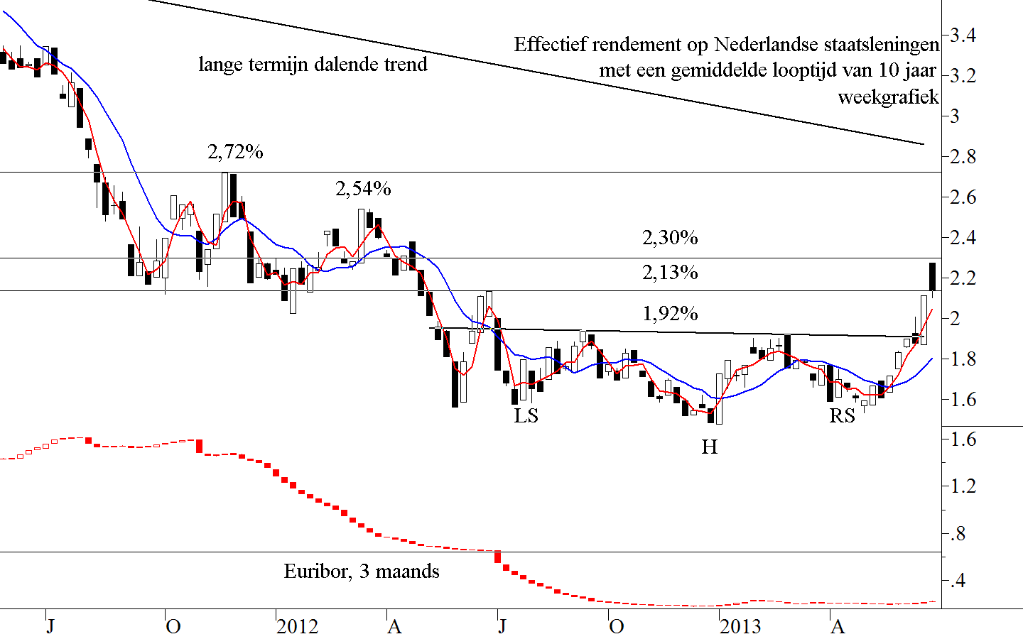 Copyright Vladeracken op de 10-jarige Nederlandse Staatsleningen reageerde. De barrière van twee eerdere toppen werd genomen en tegelijkertijd ontstond er een omgekeerd Kopschouderpatroon. De doelstelling van deze uitbraakEen koerssprong, die optreedt als een aandeel een bepaald koerspatroon verlaat of een belangrijke trendlijn doorbreekt.