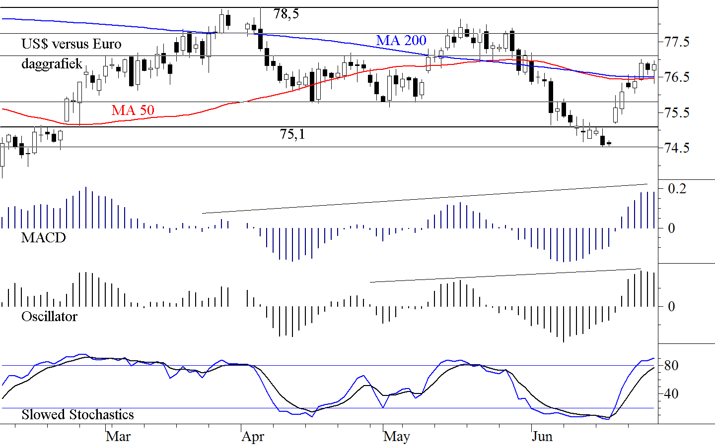 De Amerikaanse dollar heeft zijn weg naar boven naar het niveau van 78,5 weer ingeslagen. Op dit moment is hij toe aan enige rust, maar er zijn in de daggrafiek van figuur 6 geen aanwijzingen te vinden dat de stijging op een iets latere datum niet zal worden voortgezet.