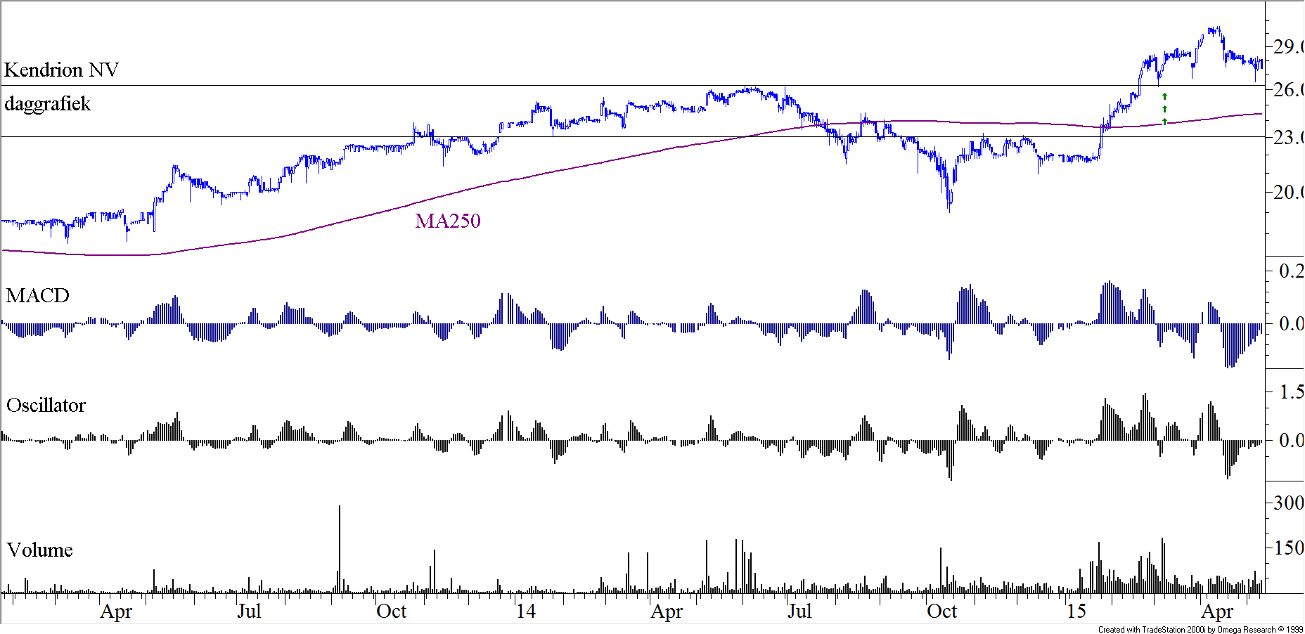 De koerstop helemaal rechts in de grafiek is deels vertekend door de dividenduitkering van € 0,78. Die uitkering is nog altijd niet goedgemaakt, iets dat vaak wel snel gebeurt. Maar het beursklimaat in de afgelopen weken zat dan ook niet mee en als men dat meeneemt, dan kan gesteld worden dat de koers van Kendrion veel beter is blijven liggen dan de beurs als geheel.