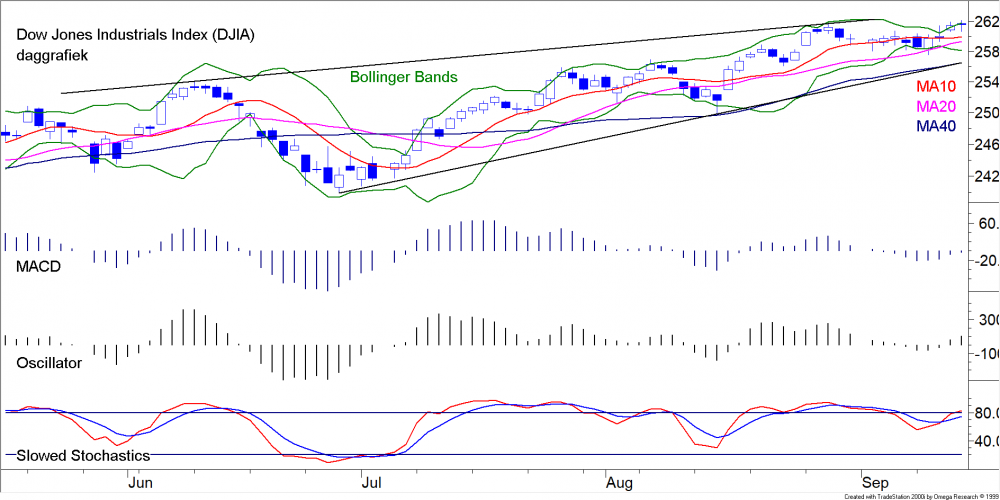 Amerika zorgde voor enige ontspanning toen aangekondigd werd dat de onderhandelingen met China hervat gingen worden. Of dit veel gaat uithalen moet nog worden bezien. Het eerste commentaar van de grote onderhandelaar was al negatief, “want Amerika had helemaal geen behoefte aan onderhandelen”. Na de oorspronkelijke positieve reactieEen daling van de koersen met 5% of meer maar minder dan 10%. Copyright Vladeracken werd het daarop stil en de door ons beschreven mogelijke Morning StarEen patroon van drie op elkaar volgende candlesticks waarbij de eerste een lang zwart lichaam heeft. De tweede opent duidelijk lager dan het slot van de eerste en heeft een klein wit of zwart lichaam en de derde opent hoger dan het slot van de voorgaande dag en sluit diep in de eerste (grote zwarte) kandelaar. Het is een bullish omkeer patroon. Copyright Vladeracken werd dan ook niet bevestigd. In de plaats daarvan ontstond er op de dag charts in Europa een licht stijgend kanaaltje dat zich tot nu toe laat aanzien als een lichte reactieEen daling van de koersen met 5% of meer maar minder dan 10%. Copyright Vladeracken, die enige druk (de oversold positie) van de ketel moet halen maar dat daarom niets anders voorstelt dan een korte onderbreking van een downtrend. Deze laatste zal dus hoogstwaarschijnlijk binnenkort weer hervat worden. Amerika doet daarin niet mee, althans nog niet. De korte termijn trendlijnen in Europa zijn naar beneden gericht, die in Amerika (nog) naar boven. De excessieve hoeveelheid kasmiddelen waarover het Amerikaanse bedrijfsleven beschikt kan daarvoor de enige reden zijn. Er was de belastingverlaging, maar er is ook de grote hoeveelheid liquide middelen, die in het buitenland werd aangehouden en die nu met een sterk verlaagd tarief terugkeert naar Amerika. De dollar voelt daar blijkbaar weinig van, misschien omdat deze liquiditeiten aangehouden werden in dollars ter voorkoming van valuta verlies, maar de inkoop van eigen aandelen slaat dit jaar alle records. Als dit een reden is achter de voortdurende stijging van de koersen dan is het ook een argument om er vanuit te gaan dat de maanden september/oktober geen grote plotselinge dalingen laten zien. Wij laten de Europese technische argumenten zien op de hieronder opgenomen daggrafiek van de DAX IndexEen gemiddelde van de 30 meest verhandelde en grootste aandelen van de Duitse beurs. Copyright Vladeracken, die het in de afgelopen week iets beter deed dan de AEX IndexEen gemiddelde van de 25 meest verhandelde en grootste aandelen van de Amsterdamse beurs. Opties op de AEX Index zijn van het Europese type. Copyright Vladeracken. Maar wij nemen een vergelijkbare daggrafiek op van de Dow Jones Industrial Index om het grote verschil te tonen dat tussen beide markten bestaat. Opvallend is het overigens dat de Japanse markt zich meer schaart bij de ontwikkelingen in Amerika.