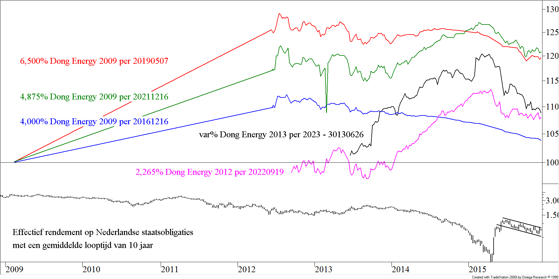 In de figuur ziet u links drie schuin oplopende lijnen, het gaat hier om de drie obligaties die in 2009 zijn uitgegeven op 100% en waarvan wij onvoldoende koersinformatie in onze database konden vinden. Vanaf begin 2012 zijn de koersen de werkelijk gerealiseerde koersen. Onderin de figuur hebben wij de renteontwikkeling van de 10-jarige rente op Nederlandse staatsobligaties opgenomen. De koersen van de obligaties zijn allemaal in 2015 gedaald. Deels ligt dat aan het feit dat de datum van aflossing nadert (dat geldt vooral voor de blauwe lijn in de grafiek want dit is de koersontwikkeling van de obligatieEen schuldbekentenis aan toonder voor een bepaald bedrag (nominale waarde) met een van tevoren vastgestelde rentevergoeding en met een terugbetalingconditie van de hoofdsom op een van tevoren vastgesteld tijdstip. Copyright Vladeracken die in 2016 moet worden afgelost). Maar de koersen zijn ook gedaald in de fase waarin de rente in Europa daalde. En dat betekent dat de risicopremieExtra rendementDe uiteindelijke opbrengst van een belegging. Bij aandelen bestaat het uit het dividend vermeerderd of verminderd met het koers-resultaat. Copyright Vladeracken op een obligatieEen schuldbekentenis aan toonder voor een bepaald bedrag (nominale waarde) met een van tevoren vastgestelde rentevergoeding en met een terugbetalingconditie van de hoofdsom op een van tevoren vastgesteld tijdstip. Copyright Vladeracken of een aandeel omdat het risicoDit wordt wel berekend als het product van de standaarddeviatie van de waardeontwikkeling van een portefeuille (aandeel) en de mutatiegraad op jaarbasis binnen deze portefeuille (van dit aandeel). Copyright Vladeracken groter wordt geacht dan normaal. Copyright Vladeracken voor Dong Energy gaande het jaar is toegenomen. Dat is overigens in lijn met de hele bedrijfsobligatiemarkt. Over een brede linie zijn koersen van bedrijfsobligaties met ratings van BBB of minder in 2015 gedaald. In de voorbije dagen lijkt in de VS zelfs een crash in de markt voor high yield obligaties aan de gang te zijn, vooral in de hoek van schalieolie.