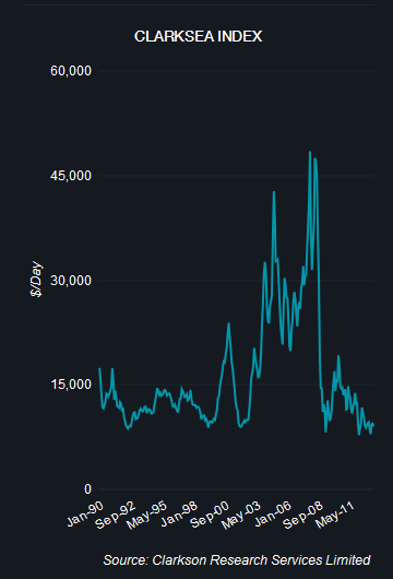 Helaas zijn er geen noteringen beschikbaar van deze twee indexen. Wel hebben wij van de website van Clarkson onderstaand plaatje gehaald van de ontwikkeling van de Clarksea Index tot en met mei 2013.