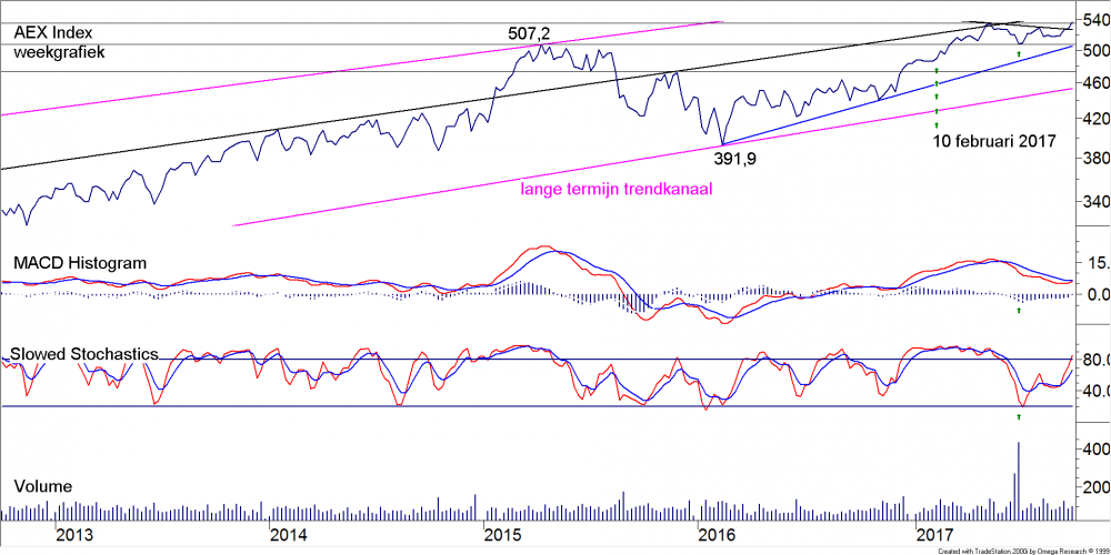 Copyright Vladeracken op weekbasis opgenomen. Het zicht wordt niet vertroebeld door allerlei zwarte of witte candles of grote en kleine uitschieters. De grafiek begint ook veel eerder in de tijd (eind 2012). De datum waarop de daggrafiek begon (10 februari 2017) hebben wij ook met vier pijltjes aangeduid in deze weekgrafiek. U ziet een groot oplopend trendkanaal. De slotkoers van afgelopen week raakt aan de top van begin dit jaar, maar is nog niet bij de bovenkant van de middenlijn in het trendkanaal. Er is dus nog ruimte. De koers had deze middenlijn begin dit jaar al aangetipt en ging toen geheel volgens het boekje omlaag. De koers keerde weer, precies op de hoogte van de vorige top op 507,2. Onder invloed van een hevige uitbraakEen koerssprong, die optreedt als een aandeel een bepaald koerspatroon verlaat of een belangrijke trendlijn doorbreekt.