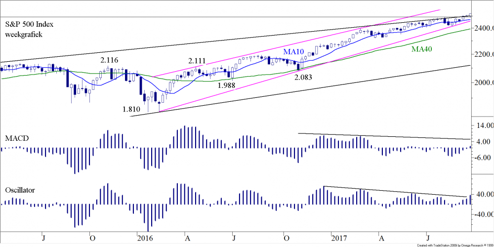 Hoe gek het ook moge klinken de meeste negatieve plaatjes zijn op dit moment te vinden in de Verenigde Staten. In Europa heeft men nog wat verbeeldingskracht nodig om te zien wat het kan gaan worden, maar als men naar de representatieve indexen uit de USA kijkt dan is er maar één conclusie mogelijk en dat is dat de stijging op zijn einde begint te lopen. Nou is dat niet nieuw, want er waren al eerder aanwijzingen, dat de euforie ten einde liep, maar steeds opnieuw kwamen er argumenten naar boven (Trump bijvoorbeeld), die de koersen weer omhoog joegen. In feite tegen beter weten in. Natuurlijk kan dit opnieuw gebeuren maar de aanwijzingen worden sterker en sterker, dat de muziek het concert wil beëindigen. In april 2016 kwam de koers van de S&P500 boven het MA40 te liggen. Sindsdien is het met slechts beperkte onderbrekingen bergopwaarts gegaan. Maar de kink lijkt nu toch in de kabel te komen zoals men kan destilleren uit figuur 3. De koers ligt boven het oplopende kanaal. Natuurlijk is dit een positie van waaruit een verdere aanval omhoog kan worden ingezet, maar uiteraard is die kans gering. En als men dan naar beneden in de figuur kijkt dan ziet men de Momentum AnalyseEen combinatie van twee momentumAlgemene term die gebruikt wordt om de snelheid van bepaalde koersbewegingen weer te geven. Het momentum meet de prijsverandering van een aandeel of index in een bepaalde periode en kan in absolute zin of als ratio worden weergegeven. Het is een oversold/overbouhgt indicator. In vergelijking met de FracMom is de Mom in het algemeen sneller in het tonen van divergentie bij bodems. Het wordt berekend door de koers van x dagen geleden af te trekken van de koers van heden.
