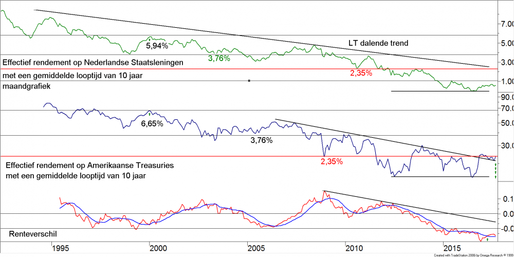 Copyright Vladeracken van 3,76% is zeker ook mogelijk. Een bloedbad op obligatiemarkten zal het gevolg zijn. Maar in Europa is het beeld nog niet zo ver. Hier stijgt de rente ook weer enigszins, maar van uitbraken omhoog (qua yield en dus omlaag qua obligatiekoersen) is hier nog geen sprake. Ook dat is op zichzelf logisch want de ECB is hier nog niet zover dat van normalisering van de balans gesproken wordt. Hier moet eerst nog de aankoop van nieuwe obligaties gestopt worden. Maar lang zal dat niet meer duren, ook in Europa gaat het economisch gezien goed en is er in feite geen enkele reden meer om de ruimgeldpolitiek van de ECB nog lang te ondersteunen. Het maakt de korte termijn voor aandelen nog altijd interessant, maar het betekent ook dat voor 2018 zich donkere wolken beginnen samen te trekken.