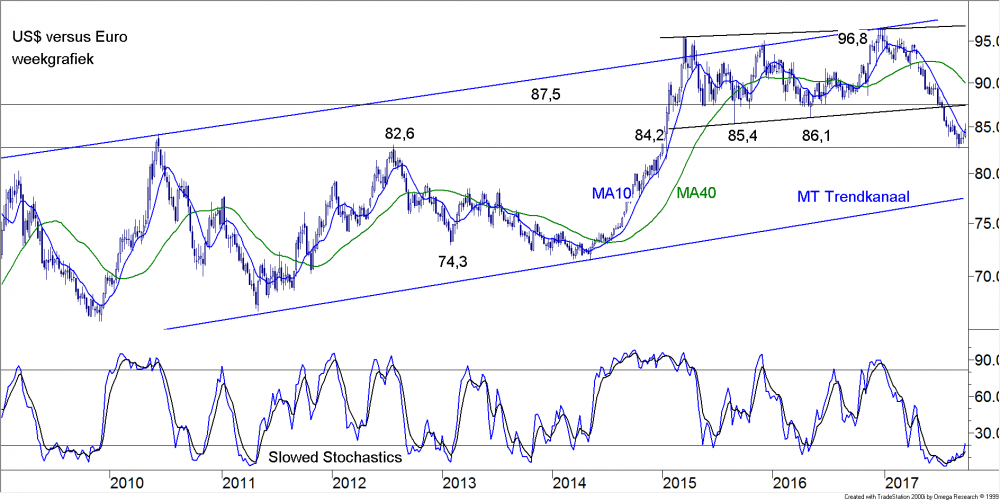 Copyright Vladeracken een pullback. En bij de $-koers, gemeten in € is hier sprake van. De koers zakte afgelopen kwartaal zonder veel moeite uit het trendkanaal dat u rechtsboven in figuur 5 getekend ziet. Vervolgens bereikte de koers het steunpunt dat wordt gevormd door de toppen uit 2010 en 2012 op 82,6. En nu veert de koers weer op (wordt de $ dus weer sterker) en moet verwacht worden dat wij een rallyEen fikse stijging van het koersniveau die volgt op een daling of op een consolidatie.