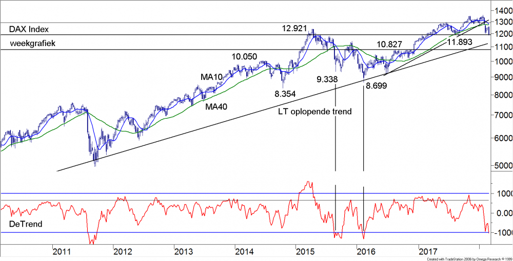 Copyright Vladeracken uit januari 2017 rond 11.870 is nu cruciaal. Als hij daardoor heen gaat vindt hij de volgende steun op zo’n 800 punten lager en als hij deze hindernis ook niet als terugkeer niveau accepteert dan zal hij nog eens 1.000 moeten inleveren voordat hij op een volgende steun aankomt.