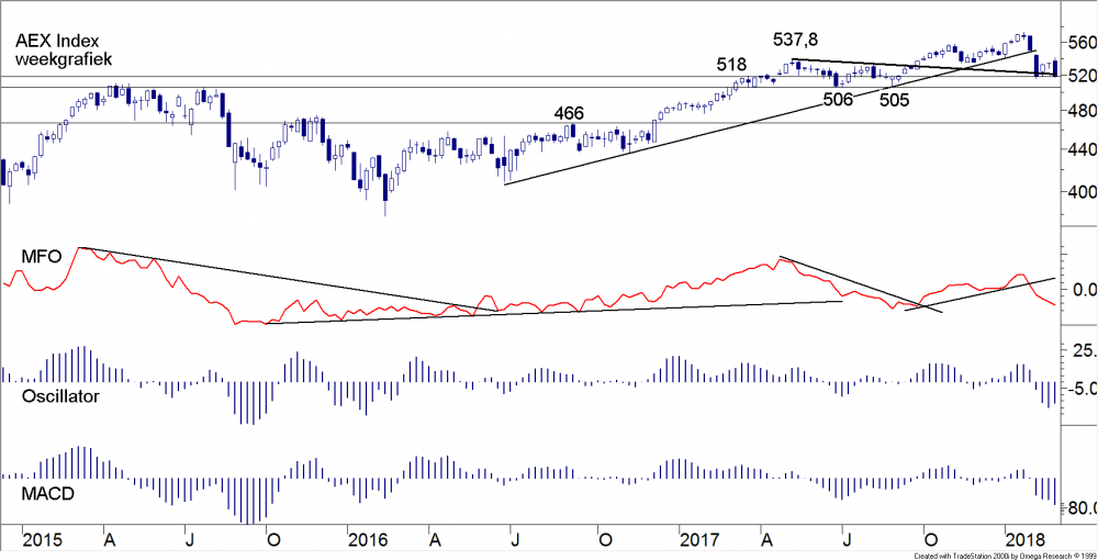 Tot slot wijzen wij op de gelijkbenige driehoek, die te onderscheiden is. Deze driehoek werd aan de onderkant verlaten. Het enige opvallende is dat afgelopen vrijdag met een witte candle werd afgesloten. De kans, dat deze gelijkbenige driehoek een vals patroon zal blijken te zijn, blijft daarmede open. De gouden bergen, die opdoemden door een verwacht zeer gunstig effect van de maatregelen bij de Amerikaanse staalfabrikanten zorgden hier ongetwijfeld voor, maar zal de Amerikaanse economie op andere fronten alsnog het gelag gaan betalen? Dat zit er natuurlijk dik in als de buitenwereld met sancties komt. In de jaren dertig waren gelijksoortige Amerikaanse maatregelen de oorzaak van een langjarige economische terugslag. En nu kan alleen grote wijsheid bij de regeringsleiders van de andere grootmachten een dergelijk scenario verhinderen. De suggestie dat na het staal de auto’s aan de beurt komen zal in eerste instantie nog wel positief uitwerken op de aandelen van autofabrikanten in de USA (alhoewel de koersen van Amerikaanse staal- en aluminiumfabrikanten ook ingeleverd hebben na de eerste aankondigingen van President Trump), maar het zal daardoor ook weer moeilijker worden om de oorlog te stoppen. De indicatoren die wij onder het koerspatroon hebben opgenomen zijn zonder meer negatief. Eerst is er het EMA5/12. Het zijn juist de Amerikaanse beleggers, die deze indicator gebruiken voor de door hen gezochte koop- en verkoopsignalen. De indicator heeft zojuist een “sell” afgegeven. Daaronder vindt u de Momentum AnalyseEen combinatie van twee momentumAlgemene term die gebruikt wordt om de snelheid van bepaalde koersbewegingen weer te geven. Het momentum meet de prijsverandering van een aandeel of index in een bepaalde periode en kan in absolute zin of als ratio worden weergegeven. Het is een oversold/overbouhgt indicator. In vergelijking met de FracMom is de Mom in het algemeen sneller in het tonen van divergentie bij bodems. Het wordt berekend door de koers van x dagen geleden af te trekken van de koers van heden. Copyright Vladeracken indicatoren (Oscillator Het verschil tussen een kortere termijn gemiddelde van een koers met dat van een langere termijn gemiddelde van dezelfde koers. Copyright Vladerackenen MacdMoving Average Convergence Divergence van Gerald Appel. Het verschil tussen een kortere termijn koers gemiddelde en een langere termijn koersgemiddelde, waarbij de beide gemiddelden berekend zijn volgens de exponentiële methode, dit in afwijking van de meer gebruikelijke rekenkundige methode. In vergelijking met de FracMACD is de MACD in het algemeen sneller in het tonen van divergentie bij bodems. De kruising van beide lijnen, de kruising met de nullijn en de divergentie kunnen signalen geven. Copyright Vladeracken) die tezamen scherper functioneren dan ieder afzonderlijk. Copyright Vladeracken, welke door ons veel gebruikt wordt. Hij is negatief en daarmede is het technische beeld voor de korte termijn heel duidelijk negatief geworden. De korte termijn voorspelt dus ellende op de grote New Yorkse beurs en daarmede natuurlijk ook voor ons in Amsterdam.
