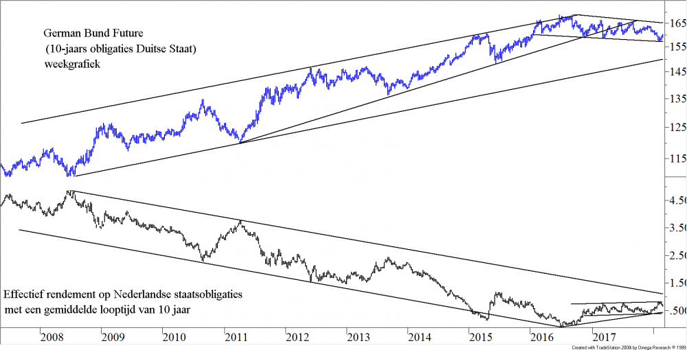 Copyright Vladeracken’s van dien. En ja, de 10-jaars rente in de VS en in Europa is gestegen. In de €-zone hebben wij in februari zelfs even een 10-jaars rente gezien van net boven 0,8%. Bezien vanaf het dieptepunt van -/- 0,1% in 2016 is dat een hele forse rentestijging die in januari zelfs iets versnelde. Maar kijkt u eens naar figuur 4. Daarin ziet u bovenin de koersgrafiek van de BundDit is een Duitse hypothetische obligatie met een coupon van 6% en een resterende looptijd van 8,5 tot 10,5 jaar. Op de Eurex worden futures op deze obligatie verhandeld en op deze futures zijn turbo’ s verkrijgbaar.
