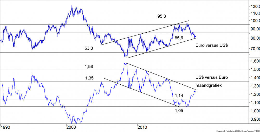 Copyright Vladeracken omlaag gaat volgen. Dan is de verzwakking van de $ niet klaar en zal het voor Europa nog moeilijker worden om te concurreren met onze grote broer in het Westen. Tariefsverhogingen zijn dan volkomen onnodig want onze producten worden dan vanzelf duurder. Maar kijkt men naar de lange termijn grafiek in figuur 5, dan doemt een ander beeld op. De koers van de $ is aangekomen bij de onderkant van een belangrijk lange termijn trendkanaal. Een doorbraak waarbij het kanaal aan de kant waar de koers zich nu bevindt verlaten wordt ligt niet voor de hand. Op zijn minst zou men een wat grotere reactieEen daling van de koersen met 5% of meer maar minder dan 10%.