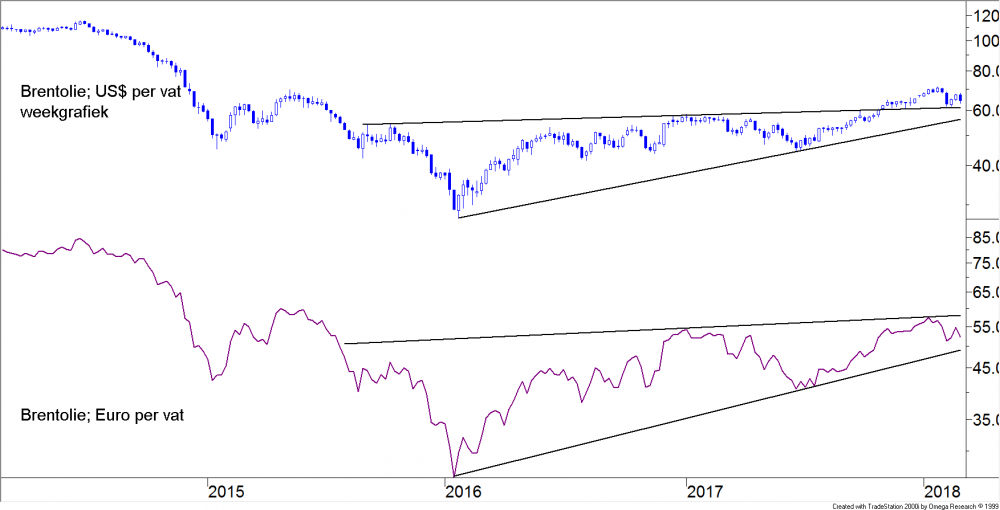 Inflatie-angst is het toverwoord de laatste tijd, maar ondertussen zien de plaatjes van veel grondstoffen er niet goed uit. In figuur 6 hebben wij twee grafieken getekend, de eerste is die van een vat Brentolie in US$’s en de tweede die van een vat Brentolie in €. En het moge u duidelijk zijn, een koers onder US$59 cq onder € 50 betekent een probleem voor de oliemarkt. Zover is het nog niet, de olieprijzen zijn wel op weg naar beneden, maar op dit moment is slechts sprake van een normale reactieEen daling van de koersen met 5% of meer maar minder dan 10%.