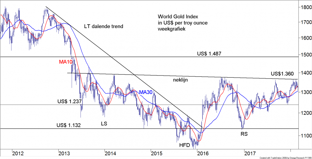 En weer is de grens van ca US$1.360 geraakt en te sterk gebleken voor een doorbraak. Goud en zilver hebben de afgelopen maand hun rol als veilige haven verzaakt. Want de koersen daalden terwijl aandelenkoersen ook daalden. En dus wordt het verhaal eentonig. Het lange termijn patroon is sterk, de weerstandKoersniveau waaronder koersen de neiging hebben om na een stijging te stabiliseren. Copyright Vladeracken op US$1.360 wordt steeds belangrijker, naar mate de grens vaker als weerstandslijn houdt. Het betekent dat een doorbraak omhoog, als die komt, steeds meer mensen op het verkeerde been zal zetten (mensen die verkopen en / of short gaanHet verkopen van effecten die men niet in bezit heeft. Ook de aankoop van Putopties valt onder dit begrip. Copyright Vladeracken zitten vlak onder deze grens). Maar voorlopig is weer een reactieEen daling van de koersen met 5% of meer maar minder dan 10%. Copyright Vladeracken omlaag ingezet en moet dus geduld betracht worden, zoals dat in feite al meer dan zes jaar het geval is! De steun om in de gaten te houden is US$1.237 gevolgd door US$1.200.