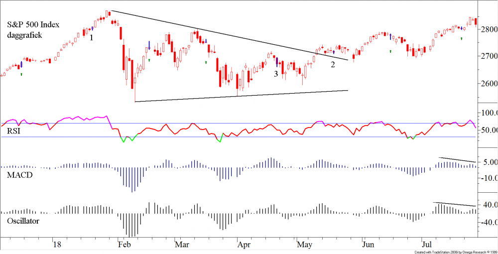 In figuur 2 nemen wij een vergelijkbare daggrafiek van de S&P500 op. Als wij zeggen vergelijkbaar, dan duidt dit op de tijdspanne. Hij is in het koerspatroon duidelijk afwijkend, met dien verstande dat de expiratiedatum ook bij de S&P500 zijn specifieke impact heeft. Er is echter geen twijfel aan dat de korte RSI ook de toppen van de S&P500 bevestigt. De daling van de RSI is al ingezet. In technische termen betekent dit, dat de bevestiging van de top een feit is. En bovenin ziet u een bearish candle (negatieve omarming) die vrijdag gezet werd. De Momentum AnalyseEen combinatie van twee momentumAlgemene term die gebruikt wordt om de snelheid van bepaalde koersbewegingen weer te geven. Het momentum meet de prijsverandering van een aandeel of index in een bepaalde periode en kan in absolute zin of als ratio worden weergegeven. Het is een oversold/overbouhgt indicator. In vergelijking met de FracMom is de Mom in het algemeen sneller in het tonen van divergentie bij bodems. Het wordt berekend door de koers van x dagen geleden af te trekken van de koers van heden. Copyright Vladeracken indicatoren (Oscillator Het verschil tussen een kortere termijn gemiddelde van een koers met dat van een langere termijn gemiddelde van dezelfde koers. Copyright Vladerackenen MacdMoving Average Convergence Divergence van Gerald Appel. Het verschil tussen een kortere termijn koers gemiddelde en een langere termijn koersgemiddelde, waarbij de beide gemiddelden berekend zijn volgens de exponentiële methode, dit in afwijking van de meer gebruikelijke rekenkundige methode. In vergelijking met de FracMACD is de MACD in het algemeen sneller in het tonen van divergentie bij bodems. De kruising van beide lijnen, de kruising met de nullijn en de divergentie kunnen signalen geven. Copyright Vladeracken) die tezamen scherper functioneren dan ieder afzonderlijk. Copyright Vladeracken is niet alleen dalende maar hij divergeert ook negatief. Het beeld van de S&P500 is daarmede duidelijk slechter dan dat van de AEX IndexEen gemiddelde van de 25 meest verhandelde en grootste aandelen van de Amsterdamse beurs. Opties op de AEX Index zijn van het Europese type. Copyright Vladeracken. Beiden wijzen op een adempauze/daling.