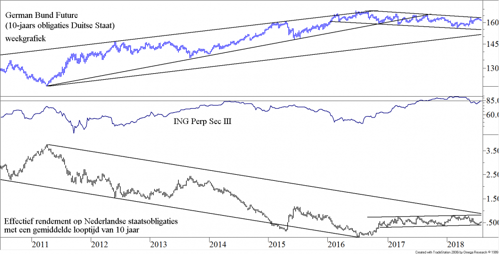 Copyright Vladeracken, de index van 10-jarige Duitse staatsleningen, en onderin ziet u de Nederlandse 10-jaars rente. De kanalen spreken elkaar in zoverre tegen dat het kanaaltje in de onderste grafiek iets oploopt en daarmee een continuatiepatroon zou kunnen zijn (en dan is het vervolg een weer sneller stijgende rente) terwijl het kanaaltje in het bovenste deel van de figuur juist een dalend kanaaltje is met als (statistische bezien) meest waarschijnlijke scenario een uitbraakEen koerssprong, die optreedt als een aandeel een bepaald koerspatroon verlaat of een belangrijke trendlijn doorbreekt.