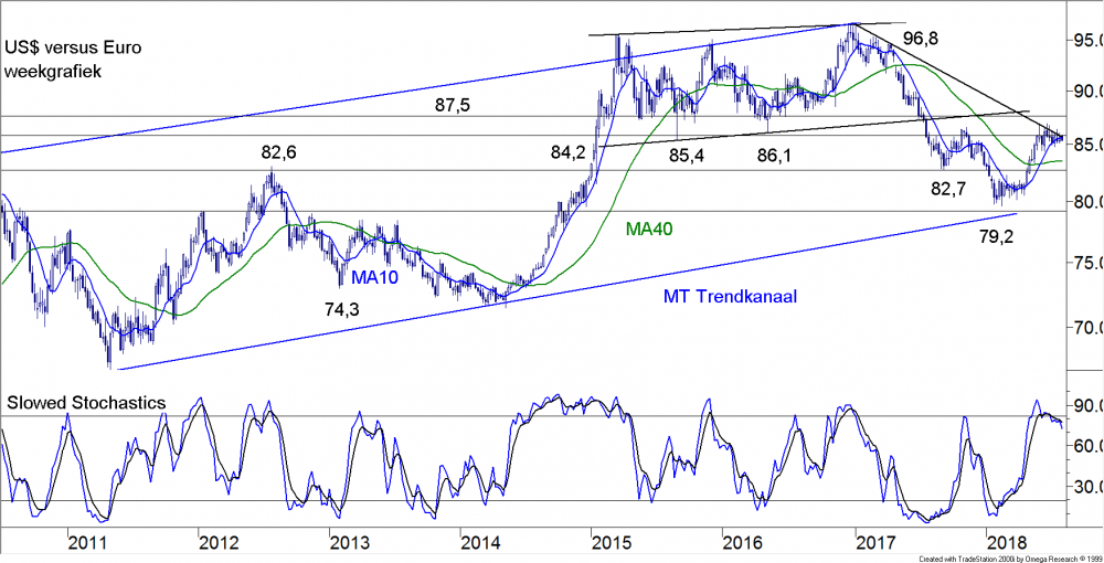 De positie van de $ is momenteel erg lastig. Als het aan President Trump ligt, dan daalt de $ ten opzichte van zoveel mogelijk grote valuta-eenheden en dus ook ten opzichte van de €. Dat zal het concurrentievoordeel van de Amerikaanse producenten helpen en de noodzaak om een heftige tariefoorlog uit te vechten verminderen. De oplopende inflatie in de VS helpt daarin zeker, die zal de waarde van de munt sneller uithollen. Maar de sterke economische groei is juist positief voor de $. Een patstelling zo lijkt het. En dat is precies wat de grafieken ons ook vertellen, er is een consolidatieEen periode waarin de koersen tijdelijk in zijwaartse richting ten opzichte van de aan de gang zijnde trendDe richting van de markt. Een opwaartse trend wordt gekarakteriseerd door een opeenvolging van hogere bodems en hogere toppen. Een neerwaartse trend wordt gekarakteriseerd door een opeenvolging van lagere bodems en lagere toppen.