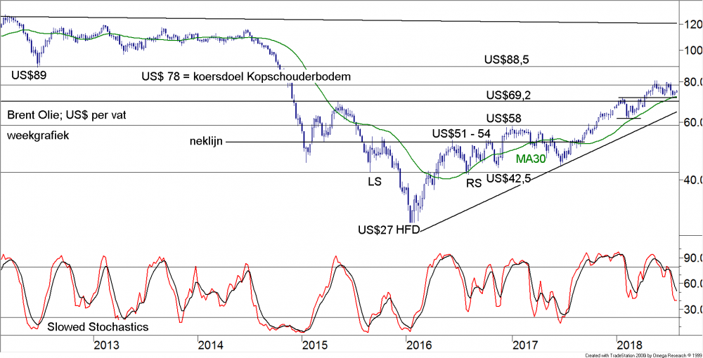 Trump heeft zijn keutel voor wat betreft Europa even ingetrokken. De US$12 miljard, die nodig waren om de sojaboeren te compenseren, was hoogstwaarschijnlijk de druppel die de emmer deed overlopen. Er ontstond op brede schaal onbegrip en afkeuring. Hij zoekt nu naar een uitweg, die hij goed kan verkopen aan zijn achterban. Juncker is in dit gat gesprongen en heeft hem een aantal lege dozen aangeboden ofwel liever gezegd enkele dozen, die al in Trump’s bezit waren. Want Europeanen konden al zoveel sojabonen kopen in Amerika als ze wilden, maar blijkbaar is het eiwitgehalte van bonen uit landen dichter bij de evenaar (Brazilië) hoger. En Europa wil maar al te graag Amerikaans gas hebben maar het is 25% duurder dan het verfoeide gas uit Rusland. Het zit er dik in dat er geen dozen gevuld zullen worden en er is dus nu sprake van een zeer wankele basis. De onderhandelingen moeten tot een snel positief resultaat leiden anders gaat de achterban en natuurlijk ook hun onbetrouwbare leider opnieuw in de aanval. Beleggers zijn dus echt niet van het probleem af, zij het dat er wel uitstel is en er is tijd gekocht om tot een nieuwe en betere afspraak te komen. Dit zal overigens zeer moeilijk blijken want Europa is en voelt zich aan zeer strenge regels (WTO) gebonden. Inmiddels is onder invloed van alle kabaal het wereldwijde transport aan het dalen. Dit is een eerste signaal van een afglijdende wereldeconomie. De resultaten van de bedrijven, die onlangs vrijkwamen zijn over het algemeen nog steeds positief. En men verwacht dat dit zo zal blijven in het vervolg van dit jaar. Ook de cijfers van het economische gebeuren van de grote landen blijven nog steeds positief. Het is dus geen wonder dat de resultaten van de Technische AnalyseEen vorm van markt analyse die uitgaat van vraag en aanbod en handelsvolume, waarbij men met behulp charts en formules gebaseerd op marktgegevens probeert vast te stellen in welke fase van haar ontwikkeling de markt zich bevindt. Copyright Vladeracken op dit moment duiden op een positieve markt, zij het dat de korte termijn om een adempauze vraagt teneinde nieuwe krachten te verzamelen. Dit kan gebeuren in een consolidatieEen periode waarin de koersen tijdelijk in zijwaartse richting ten opzichte van de aan de gang zijnde trendDe richting van de markt. Een opwaartse trend wordt gekarakteriseerd door een opeenvolging van hogere bodems en hogere toppen. Een neerwaartse trend wordt gekarakteriseerd door een opeenvolging van lagere bodems en lagere toppen. Copyright Vladeracken bewegen. In het algemeen geldt dat de prijzen even rust nemen alvorens hun weg te vervolgen. Zie ook congestieperiode. Copyright Vladeracken of een lichte daling van de indexen, maar lang zal dit niet duren en veel zal het niet om het lijf hebben. Als men de grote markten de revue laat passeren dan valt het op dat MomentumAlgemene term die gebruikt wordt om de snelheid van bepaalde koersbewegingen weer te geven. Het momentum meet de prijsverandering van een aandeel of index in een bepaalde periode en kan in absolute zin of als ratio worden weergegeven. Het is een oversold/overbouhgt indicator. In vergelijking met de FracMom is de Mom in het algemeen sneller in het tonen van divergentie bij bodems. Het wordt berekend door de koers van x dagen geleden af te trekken van de koers van heden. Copyright Vladeracken Analyses in de daggrafieken bijna overal de daling hebben ingezet. Alleen in Duitsland (de zwakste markt van de afgelopen tijd) is de DAX nog niet zover. In Amerika blijft ook de Dow Jones Industrial Index achter maar hij heeft de draai ingezet. Op de week charts is de eensgezindheid nog groter. De MomanMomentum analyse. Een combinatie van twee momentum indicatoren (Oscillator en MacdMoving Average Convergence Divergence van Gerald Appel. Het verschil tussen een kortere termijn koers gemiddelde en een langere termijn koersgemiddelde, waarbij de beide gemiddelden berekend zijn volgens de exponentiële methode, dit in afwijking van de meer gebruikelijke rekenkundige methode. In vergelijking met de FracMACD is de MACD in het algemeen sneller in het tonen van divergentie bij bodems. De kruising van beide lijnen, de kruising met de nullijn en de divergentie kunnen signalen geven. Copyright Vladeracken) die tezamen scherper functioneren dan ieder afzonderlijk. Copyright Vladeracken is overal stijgende. Op de maandgrafieken zijn het Japan en de S&P500 die roet in het eten gooien. De eerste toont een duidelijke dalende MomanMomentum analyse. Een combinatie van twee momentum indicatoren (Oscillator en MacdMoving Average Convergence Divergence van Gerald Appel. Het verschil tussen een kortere termijn koers gemiddelde en een langere termijn koersgemiddelde, waarbij de beide gemiddelden berekend zijn volgens de exponentiële methode, dit in afwijking van de meer gebruikelijke rekenkundige methode. In vergelijking met de FracMACD is de MACD in het algemeen sneller in het tonen van divergentie bij bodems. De kruising van beide lijnen, de kruising met de nullijn en de divergentie kunnen signalen geven. Copyright Vladeracken) die tezamen scherper functioneren dan ieder afzonderlijk. Copyright Vladeracken en de tweede toont een dalende MomanMomentum analyse. Een combinatie van twee momentum indicatoren (Oscillator en MacdMoving Average Convergence Divergence van Gerald Appel. Het verschil tussen een kortere termijn koers gemiddelde en een langere termijn koersgemiddelde, waarbij de beide gemiddelden berekend zijn volgens de exponentiële methode, dit in afwijking van de meer gebruikelijke rekenkundige methode. In vergelijking met de FracMACD is de MACD in het algemeen sneller in het tonen van divergentie bij bodems. De kruising van beide lijnen, de kruising met de nullijn en de divergentie kunnen signalen geven. Copyright Vladeracken) die tezamen scherper functioneren dan ieder afzonderlijk. Copyright Vladeracken die omhoog draaiend is. Tot slot is het ook nog interessant te vermelden dat in Nederland de onderligge