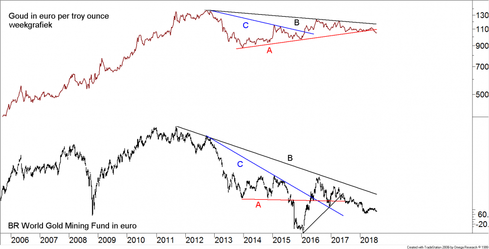 Copyright Vladeracken met kracht gedaan. De doorbraak omlaag (A) is bovendien na de test van lijn B geschied en dat is een zeer slecht teken. Wij zijn, vanuit fundamenteel oogpunt, voorstander van een structurele positie in goud en /of goudmijnbouwaandelen. Maar voorlopig heeft ons dat niets anders dan verlies gebracht. Bijkopen doen wij in elk geval voorlopig niet, er is in dit beeld geen enkele aanleiding om posities uit te breiden.