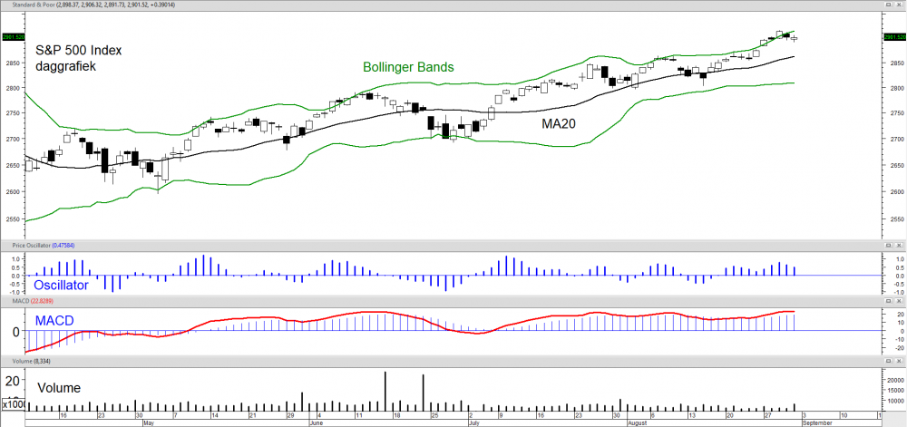 In vergelijking met de grafiek van de AEX IndexEen gemiddelde van de 25 meest verhandelde en grootste aandelen van de Amsterdamse beurs. Opties op de AEX Index zijn van het Europese type. Copyright Vladeracken in figuur 1 geeft die van de S&P500 Index zoals gezegd een volledig andere beeld. Aangekomen op zijn MA20 schoot de S&P500 weer omhoog en hij zette nieuwe All-Time Highs. Hij stond daarin niet alleen want de NasdaqNational Association of Securities Dealers Automated Quotations. De Amerikaanse nationale schermenbeurs. Copyright Vladeracken deed dat ook. De NasdaqNational Association of Securities Dealers Automated Quotations. De Amerikaanse nationale schermenbeurs. Copyright Vladeracken was zelfs de gedeeltelijke oorzaak van deze opleving. Maar juist door de hoge ligging ziet de Momentum AnalyseEen combinatie van twee momentumAlgemene term die gebruikt wordt om de snelheid van bepaalde koersbewegingen weer te geven. Het momentum meet de prijsverandering van een aandeel of index in een bepaalde periode en kan in absolute zin of als ratio worden weergegeven. Het is een oversold/overbouhgt indicator. In vergelijking met de FracMom is de Mom in het algemeen sneller in het tonen van divergentie bij bodems. Het wordt berekend door de koers van x dagen geleden af te trekken van de koers van heden. Copyright Vladeracken indicatoren (Oscillator Het verschil tussen een kortere termijn gemiddelde van een koers met dat van een langere termijn gemiddelde van dezelfde koers. Copyright Vladerackenen MacdMoving Average Convergence Divergence van Gerald Appel. Het verschil tussen een kortere termijn koers gemiddelde en een langere termijn koersgemiddelde, waarbij de beide gemiddelden berekend zijn volgens de exponentiële methode, dit in afwijking van de meer gebruikelijke rekenkundige methode. In vergelijking met de FracMACD is de MACD in het algemeen sneller in het tonen van divergentie bij bodems. De kruising van beide lijnen, de kruising met de nullijn en de divergentie kunnen signalen geven. Copyright Vladeracken) die tezamen scherper functioneren dan ieder afzonderlijk. Copyright Vladeracken er veel minder gunstig uit. Hij verschilt niet door het feit dat hij daalt, maar zijn divergentieEen situatie waarbij een koersbeweging van een aandeel of van een index niet bevestigd wordt door het koersverloop van een indicator of van een andere index. Het is een vroege indicatie voor een mogelijke trendomkeer. Copyright Vladeracken vinden wij duidelijk negatief, hetgeen misschien niet door iedereen onderstreept zal worden. Het VolumeOmzet. De hoeveelheid aandelen (in stuks) welke op een gegeven dag wordt verhandeld. Copyright Vladeracken is ook niet in orde, het daalde in de stijging en was afgelopen vrijdag zelfs relatief hoog, op een dalende dag. En die van de Dow Jones Industrial Index (DJIA) tonen hetzelfde beeld als die behorende bij de AEX IndexEen gemiddelde van de 25 meest verhandelde en grootste aandelen van de Amsterdamse beurs. Opties op de AEX Index zijn van het Europese type. Copyright Vladeracken en de S&P500. Alleen in dit geval betreft het volumeOmzet. De hoeveelheid aandelen (in stuks) welke op een gegeven dag wordt verhandeld. Copyright Vladeracken gegevens van een index die weliswaar geen All-Time High neerzette, maar die wel de bovenkant van de Bollinger BandsTwee lijnen die aan weerszijde getekend worden waarbij de afstand tot de koersen bepaald wordt door een aantal te kiezen standaarddeviaties (meestal twee) van de koers tot aan een te kiezen voortschrijdend gemiddelde van de koersen. Deze lijnen worden geacht WeerstandKoersniveau waaronder koersen de neiging hebben om na een stijging te stabiliseren. Copyright Vladeracken en Steun aan te geven. Formule: Band 1 = SMA(x) + BandFactor*STDEV(x) en Band 2 = SMA(x) – BandFactor*STDEV(x) waarbij SMA = eenvoudig voortschrijdend gemiddelde; STDEV = standaarddeviatie van de dagelijkse slotkoers; x = de periode. Bollinger gebruikte de doorschrijding van de banden door de koers als signalen. De bevestiging zocht hij in het short term On Balance VolumeOmzet. De hoeveelheid aandelen (in stuks) welke op een gegeven dag wordt verhandeld. Copyright Vladeracken en in een Money FlowHet volumeOmzet. De hoeveelheid aandelen (in stuks) welke op een gegeven dag wordt verhandeld. Copyright Vladeracken vermenigvuldigd met de slotkoers van de dag. Als deze laatste lager is dan de vorige dag dan is de Money Flow negatief en als hij hoger is dan is de Money Flow positief. In plaats van de slotkoers wordt vaak de gemiddelde koers van de dag genomen. Copyright Vladeracken Indicator. Copyright Vladeracken oversteeg. Relatief gezien ligt de Momentum AnalyseEen combinatie van twee momentumAlgemene term die gebruikt wordt om de snelheid van bepaalde koersbewegingen weer te geven. Het momentum meet de prijsverandering van een aandeel of index in een bepaalde periode en kan in absolute zin of als ratio worden weergegeven. Het is een oversold/overbouhgt indicator. In vergelijking met de FracMom is de Mom in het algemeen sneller in het tonen van divergentie bij bodems. Het wordt berekend door de koers van x dagen geleden af te trekken van de koers van heden. Copyright Vladeracken indicatoren (Oscillator Het verschil tussen een kortere termijn gemiddelde van een koers met dat van een langere termijn gemiddelde van dezelfde koers. Copyright Vladerackenen MacdMoving Average Convergence Divergence van Gerald Appel. Het verschil tussen een kortere termijn koers gemiddelde en een langere termijn koersgemiddelde, waarbij de beide gemiddelden berekend zijn volgens de exponentiële methode, dit in afwijking van de meer gebruikelijke rekenkundige methode. In vergelijking met de FracMACD is de MACD in het algemeen sneller in het tonen van divergentie bij bodems. De kruising van beide lijnen, de kruising met de nullijn en de divergentie kunnen signalen geven. Copyright Vladeracken) die tezamen scherper functioneren dan ieder afzonderlijk. Copyright Vladeracken ook veel hoger d