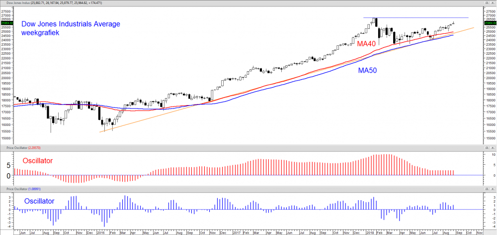 In tegenstelling tot wat in de afgelopen week nog al eens beweerd werd heeft de Dow Jones Industrial Index geen nieuw All-Time High gezet. Hij heeft wel, zoals duidelijk te zien is in de grafiek van de weekkoersen, een nieuwe top gezet maar dat hoeft niet de laatste te zijn. Wij verwijzen daarom naar de grote Oscillator, die in rood getekend staat onder de koersen. Het is een langzame maar wel een heel zekere lange termijn indicator en op dit moment is hij nog steeds stijgende, zij het dat hij laag ligt en de top al langer achter zich gelaten heeft.. Daaronder vindt u in blauw de Oscillator Het verschil tussen een kortere termijn gemiddelde van een koers met dat van een langere termijn gemiddelde van dezelfde koers. Copyright Vladerackenuit onze normale Momentum AnalyseEen combinatie van twee momentumAlgemene term die gebruikt wordt om de snelheid van bepaalde koersbewegingen weer te geven. Het momentum meet de prijsverandering van een aandeel of index in een bepaalde periode en kan in absolute zin of als ratio worden weergegeven. Het is een oversold/overbouhgt indicator. In vergelijking met de FracMom is de Mom in het algemeen sneller in het tonen van divergentie bij bodems. Het wordt berekend door de koers van x dagen geleden af te trekken van de koers van heden. Copyright Vladeracken indicatoren (Oscillator Het verschil tussen een kortere termijn gemiddelde van een koers met dat van een langere termijn gemiddelde van dezelfde koers. Copyright Vladerackenen MacdMoving Average Convergence Divergence van Gerald Appel. Het verschil tussen een kortere termijn koers gemiddelde en een langere termijn koersgemiddelde, waarbij de beide gemiddelden berekend zijn volgens de exponentiële methode, dit in afwijking van de meer gebruikelijke rekenkundige methode. In vergelijking met de FracMACD is de MACD in het algemeen sneller in het tonen van divergentie bij bodems. De kruising van beide lijnen, de kruising met de nullijn en de divergentie kunnen signalen geven. Copyright Vladeracken) die tezamen scherper functioneren dan ieder afzonderlijk. Copyright Vladeracken en ook deze zowel als de bijbehorende MACDMoving Average Convergence Divergence van Gerald Appel. Het verschil tussen een kortere termijn koers gemiddelde en een langere termijn koersgemiddelde, waarbij de beide gemiddelden berekend zijn volgens de exponentiële methode, dit in afwijking van de meer gebruikelijke rekenkundige methode. In vergelijking met de FracMACD is de MACD in het algemeen sneller in het tonen van divergentie bij bodems. De kruising van beide lijnen, de kruising met de nullijn en de divergentie kunnen signalen geven. Copyright Vladeracken zijn stijgende. Een dergelijke stijging van dit laatste samenstel vindt men in alle weekgrafieken met één uitzondering en dat is de weekgrafiek van de AEX IndexEen gemiddelde van de 25 meest verhandelde en grootste aandelen van de Amsterdamse beurs. Opties op de AEX Index zijn van het Europese type. Copyright Vladeracken. In Amsterdam heeft de Momentum AnalyseEen combinatie van twee momentumAlgemene term die gebruikt wordt om de snelheid van bepaalde koersbewegingen weer te geven. Het momentum meet de prijsverandering van een aandeel of index in een bepaalde periode en kan in absolute zin of als ratio worden weergegeven. Het is een oversold/overbouhgt indicator. In vergelijking met de FracMom is de Mom in het algemeen sneller in het tonen van divergentie bij bodems. Het wordt berekend door de koers van x dagen geleden af te trekken van de koers van heden. Copyright Vladeracken indicatoren (Oscillator Het verschil tussen een kortere termijn gemiddelde van een koers met dat van een langere termijn gemiddelde van dezelfde koers. Copyright Vladerackenen MacdMoving Average Convergence Divergence van Gerald Appel. Het verschil tussen een kortere termijn koers gemiddelde en een langere termijn koersgemiddelde, waarbij de beide gemiddelden berekend zijn volgens de exponentiële methode, dit in afwijking van de meer gebruikelijke rekenkundige methode. In vergelijking met de FracMACD is de MACD in het algemeen sneller in het tonen van divergentie bij bodems. De kruising van beide lijnen, de kruising met de nullijn en de divergentie kunnen signalen geven. Copyright Vladeracken) die tezamen scherper functioneren dan ieder afzonderlijk. Copyright Vladeracken reeds voor de tweede achtereenvolgende week een daling getoond. Amsterdam was in Europa de beste beurs en men zou hem daarom een vooruit lopende profeet kunnen noemen maar dat rijmt zich niet met het feit dat de index van een nog veel betere beurs (de DJIA) nog geen dalende Momentum AnalyseEen combinatie van twee momentumAlgemene term die gebruikt wordt om de snelheid van bepaalde koersbewegingen weer te geven. Het momentum meet de prijsverandering van een aandeel of index in een bepaalde periode en kan in absolute zin of als ratio worden weergegeven. Het is een oversold/overbouhgt indicator. In vergelijking met de FracMom is de Mom in het algemeen sneller in het tonen van divergentie bij bodems. Het wordt berekend door de koers van x dagen geleden af te trekken van de koers van heden. Copyright Vladeracken indicatoren (Oscillator Het verschil tussen een kortere termijn gemiddelde van een koers met dat van een langere termijn gemiddelde van dezelfde koers. Copyright Vladerackenen MacdMoving Average Convergence Divergence van Gerald Appel. Het verschil tussen een kortere termijn koers gemiddelde en een langere termijn koersgemiddelde, waarbij de beide gemiddelden berekend zijn volgens de exponentiële methode, dit in afwijking van de meer gebruikelijke rekenkundige methode. In vergelijking met de FracMACD is de MACD in het algemeen sneller in het tonen van divergentie bij bodems. De kruising van beide lijnen, de kruising met de nullijn en de divergentie kunnen signalen geven. Copyright Vladeracken) die tezamen scherper functioneren dan ieder afzonderlijk. Copyright Vladeracken laat zien. De beide MA’s liggen correct ten opzichte van elkaa