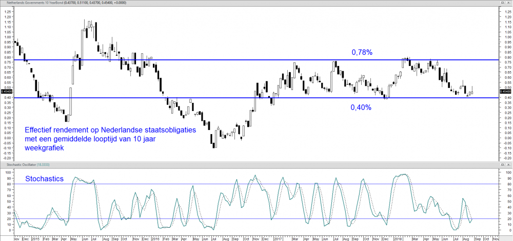 Iedereen weet inmiddels dat de ECB haar QE-programma dit jaar zal beëindigen. Iedereen weet ook dat de Amerikaanse FED de korte rente in de VS nog verder zal laten oplopen. Maar als u in figuur 4 kijkt naar de 10-jaars rente in Nederland, dan ziet u een lage rente, die ook nog eens vooral zijwaarts beweegt. Waar blijft dan die door velen voorspelde rentestijging in de Europese kapitaalmarkten? Welaan, voorlopig is hij er nog lang niet. Het beeld is wat oversold, de rente kan binnen de range van 0,40% aan de onderkant en 0,78% aan de bovenkant best weer wat oplopen, en gelet op de Stochasticsvan George Lane. De formule is gebaseerd op het gegeven dat wanneer koersen stijgen de slotkoers de neiging heeft om dichter bij de hoogste koers van de dag te komen terwijl in dalende trends de slotkoers de neiging heeft om dichter bij de laagste koers van de dag te komen. Er worden twee lijnen getekend de %K en de %D die elkaar moeten kruisen. De formule luidt: %K = 100*[(Slotkoers – L5) / (H5 – L5)]; %D = 100*(H3 / L3) waarbij L5 = Lowest Low van de laatste vijf dagen; H5 = Highest High van de laaste vijf dagen. Men gebruikt een Slowed Stochastics en een Fast Stochastics. De Slowed Stochastics is in tegenstelling tot de Fast Stochastics verzacht door het gebruik van een voortschrijdend gemiddelde. Copyright Vladeracken onderin de figuur is die stijging net begonnen, maar van een doorbraak omhoog is nog geen sprake. Moet men dan niet bang zijn voor een stijging van de rente? Natuurlijk wel. Want als die rente eenmaal stijgt, dan is een vergoeding van 0,45%, zoals u die momenteel krijgt voor 10-jarige leningen, natuurlijk nooit genoeg om de koersval van lange obligaties op te vangen die dan ontstaat, ook niet als u die lage vergoeding al enkele jaren ontvangt. En dus doen wij wat wij al langer tijd doen met onze obligaties, wij laten de aflossingen binnenkomen en blijven dan met de zo verkregen contanten aan de kant staan, in afwachting van een betere, hogere vergoeding.