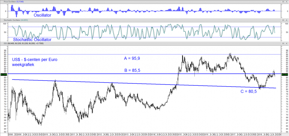 De grens rond 85,5 (zie figuur 5, lijn B) is een hele belangrijke. In 2015 en vervolgens weer in 2017 is deze grens verschillende keren een te zware barrière gebleken en moest de koers op dat punt rechtsomkeer maken. De uitbraakEen koerssprong, die optreedt als een aandeel een bepaald koerspatroon verlaat of een belangrijke trendlijn doorbreekt. Copyright Vladeracken begin augustus leek dan ook een hele significante. Maar de draai die enkele dagen later alweer optrad, bracht de koers weer onder die grens. Een valse uitbraakEen koerssprong, die optreedt als een aandeel een bepaald koerspatroon verlaat of een belangrijke trendlijn doorbreekt. Copyright Vladeracken zo lijkt het. In fundamentele zin mag niemand dat verwonderen. Terwijl in Europa de overheidshuishoudboekjes overal steeds sluitender worden, heeft President Trump de sluizen volledig open gezet. Hij heeft wel de belastingen verlaagd maar bezuinigingen staan daar niet tegenover. En zolang als er door de mensheid van geld als betaalmiddel gebruik is gemaakt geldt: druk je teveel geld, dan wordt dat waardeloos. Op termijn zou de dollar daarom structureel ten opzichte van de euro moeten verzwakken. De uitbraakEen koerssprong, die optreedt als een aandeel een bepaald koerspatroon verlaat of een belangrijke trendlijn doorbreekt. Copyright Vladeracken begin augustus was dan ook verdacht. Maar niet vergeten moet worden dat de rente in de VS duidelijk hoger ligt dan in Europa. Dat maakt de $ aantrekkelijker. Wie deze slag gaat winnen? Figuur 5 laat zien dat de € afgelopen week een volgende punt gescoord heeft: De korte termijn richting is omlaag en het doel van deze beweging is eerder 80,5 (bij C) dan 95,9 (bij A). Worden de brandstofprijzen dan weer hoger? Dat valt nog te bezien gezien onze visie op de US$. Het zou zomaar kunnen zijn, dat de stijging van de olieprijzen in $’s gecompenseerd wordt door een daling van de koers van de $.