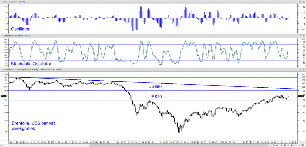 Wij hebben het al eerder gezegd, de olieprijzen zitten in een opwaartse trendDe richting van de markt. Een opwaartse trend wordt gekarakteriseerd door een opeenvolging van hogere bodems en hogere toppen. Een neerwaartse trend wordt gekarakteriseerd door een opeenvolging van lagere bodems en lagere toppen. Copyright Vladeracken en die is nog (lang) niet voorbij. Er is een correcte geweest, die heeft bijna twee maanden geduurd, olieprijzen hebben in een range van minder dan 10% heen en weer bewogen en afgelopen weken is de opgaande trendDe richting van de markt. Een opwaartse trend wordt gekarakteriseerd door een opeenvolging van hogere bodems en hogere toppen. Een neerwaartse trend wordt gekarakteriseerd door een opeenvolging van lagere bodems en lagere toppen. Copyright Vladeracken weer hervat. Het koersdoel voor de komende weken / maanden is US$90 per vat Brentolie en er lijkt niets meer in de weg te staan om dit doel te gaan halen.