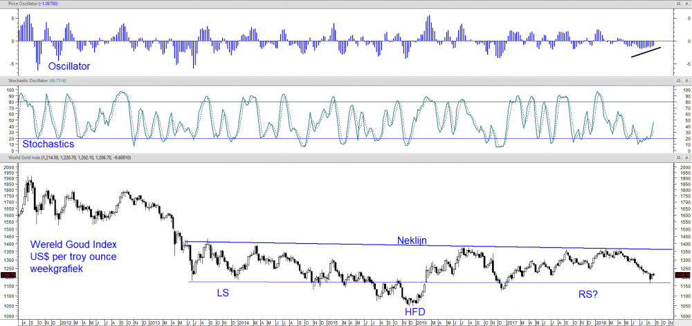 Het kan “wish-full-thinking” genoemd worden, zeker als men al posities in goud en goudmijnbouwaandelen heeft. In figuur 7 hebben wij een weekgrafiek opgenomen van het goud, in $’s. Bovenin zijn twee indicatoren getekend (een Oscillator Het verschil tussen een kortere termijn gemiddelde van een koers met dat van een langere termijn gemiddelde van dezelfde koers. Copyright Vladerackenen een Stochasticsvan George Lane. De formule is gebaseerd op het gegeven dat wanneer koersen stijgen de slotkoers de neiging heeft om dichter bij de hoogste koers van de dag te komen terwijl in dalende trends de slotkoers de neiging heeft om dichter bij de laagste koers van de dag te komen. Er worden twee lijnen getekend de %K en de %D die elkaar moeten kruisen. De formule luidt: %K = 100*[(Slotkoers – L5) / (H5 – L5)]; %D = 100*(H3 / L3) waarbij L5 = Lowest Low van de laatste vijf dagen; H5 = Highest High van de laaste vijf dagen. Men gebruikt een Slowed Stochastics en een Fast Stochastics. De Slowed Stochastics is in tegenstelling tot de Fast Stochastics verzacht door het gebruik van een voortschrijdend gemiddelde. Copyright Vladeracken) die beiden wijzen op een reactieEen daling van de koersen met 5% of meer maar minder dan 10%. Copyright Vladeracken omhoog die is begonnen en nog een weg te gaan heeft. Daaronder is de koersgrafiek van het goud weergegeven en daarin hebben wij een kopschouderbodem getekend. De neklijnSteun of weerstandsniveau onder andere in een Kop & Schouder patroon. De neklijn verbindt de toppen of bodems van het patroon afhankelijk van het feit of het een top- of bodemformatie is. Copyright Vladeracken, de linkerschouder (LS) en het hoofd (HFD) zijn wel helder, maar of de rechterschouder (RS) dat uiteindelijk wordt is pas vast te stellen als de neklijnSteun of weerstandsniveau onder andere in een Kop & Schouder patroon. De neklijn verbindt de toppen of bodems van het patroon afhankelijk van het feit of het een top- of bodemformatie is. Copyright Vladeracken in opwaartse zin is doorbroken (het patroon is niet erg evenwichtig). Wij houden op deze plek al langer rekening met dit scenario. Maar dan zou nu wel een rallyEen fikse stijging van het koersniveau die volgt op een daling of op een consolidatie. Copyright Vladeracken moeten plaatsvinden waarbij het goud richting de neklijnSteun of weerstandsniveau onder andere in een Kop & Schouder patroon. De neklijn verbindt de toppen of bodems van het patroon afhankelijk van het feit of het een top- of bodemformatie is. Copyright Vladeracken opstoomt op ongeveer US$ 1.360 per troy ounce. Het voordeel van deze visie is dat hij zo ongeveer contrair ten opzichte van elke commentator en analist is, maar belangrijker is het bewijs en dat is nog niet geleverd. Kortom, de goudprijsVolgens Ray Dalio zal de goudprijs, gezien op lange termijn, tenderen naar een waarde die gelijk is aan de totale hoeveelheid geld in omloop gedeeld door de totale voorraad goud. Copyright Vladeracken is aan eens stijging begonnen, maar lange termijn posities innemen of uitbreiden, daar is het nog te vroeg voor. Steun ligt er op US1.165 en die is sterk.