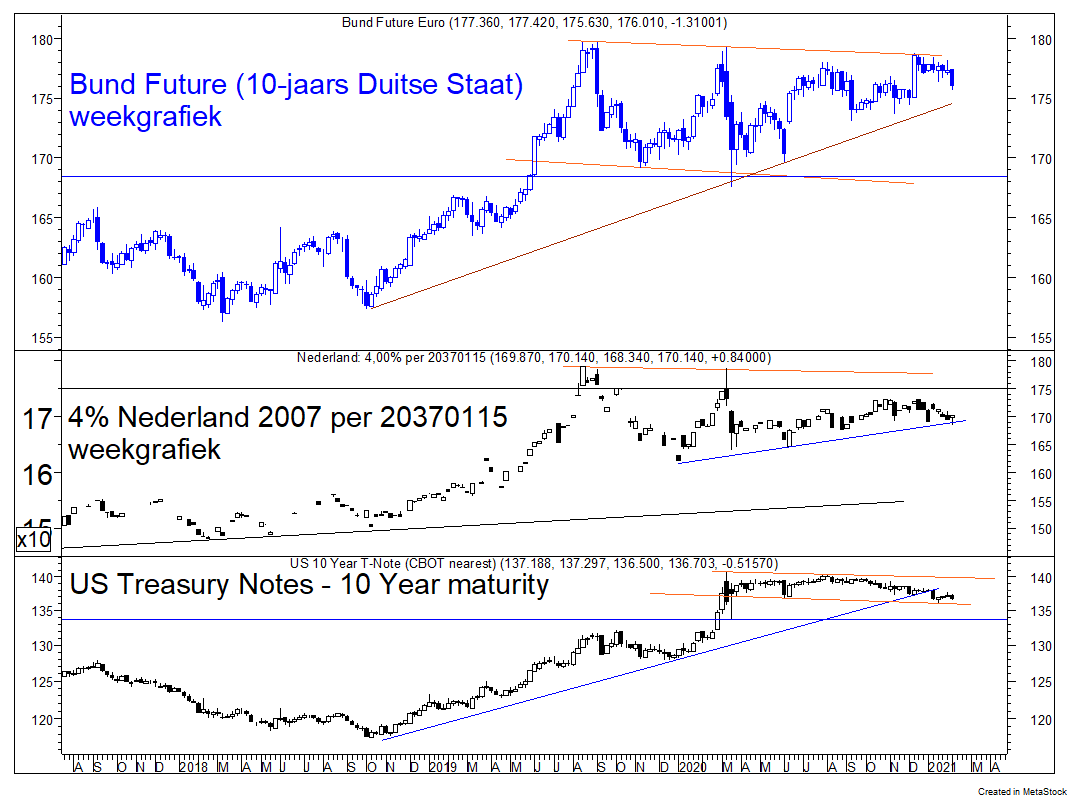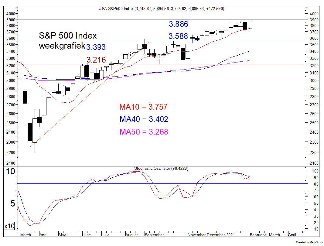 De S&P500 zette een nieuw All-Time High. In België verscheen er een mooie top in de grafiek. Voor het overige zag men op de meeste beurzen een beperkte stijging, die de eerdere daling op een duidelijk steunpunt tot staan bracht. De daggrafiek van de AEX IndexEen gemiddelde van de 25 meest verhandelde en grootste aandelen van de Amsterdamse beurs. Opties op de AEX Index zijn van het Europese type. Copyright Vladeracken, die wij in figuur 1 tonen, is daarvan een helder voorbeeld. De daling stopte een week geleden op het eerste steunpunt dat de koers tegenkwam en dat was op 633. Een herstel volgde in de afgelopen week, maar de muziek lijkt al weer op weg naar de uitgang te zijn. Parallel aan de steunlijn op 633 kan er rond 667 een bovenzijde getekend worden van een mogelijk kanaal. Hiermede is dan een mogelijk consolidatiegebied afgetekend en als dat verder wordt ingevuld krijgt de beurs de tijd beschikbaar om een aantal zaken in orde te brengen zoals bijvoorbeeld de grote afstand tussen de koers en het MA200. De indicatoren onderaan in de figuur wijzen niet op een aanstaande rallyEen fikse stijging van het koersniveau die volgt op een daling of op een consolidatie. Copyright Vladeracken en dergelijke positieve aanwijzingen vindt men ook niet in de weekgrafiek. De tijd om een aantal zaken recht te zetten is dus gekomen en het ideale beeld is dan natuurlijk een consolidatieEen periode waarin de koersen tijdelijk in zijwaartse richting ten opzichte van de aan de gang zijnde trendDe richting van de markt. Een opwaartse trend wordt gekarakteriseerd door een opeenvolging van hogere bodems en hogere toppen. Een neerwaartse trend wordt gekarakteriseerd door een opeenvolging van lagere bodems en lagere toppen. Copyright Vladeracken bewegen. In het algemeen geldt dat de prijzen even rust nemen alvorens hun weg te vervolgen. Zie ook congestieperiode. Copyright Vladeracken zoals wij deze hier schetsen. Maar er wordt geen zekerheid afgegeven, dat het herstel tot normale omstandigheden zich enkel en alleen zal beperken tot een consolidatieEen periode waarin de koersen tijdelijk in zijwaartse richting ten opzichte van de aan de gang zijnde trendDe richting van de markt. Een opwaartse trend wordt gekarakteriseerd door een opeenvolging van hogere bodems en hogere toppen. Een neerwaartse trend wordt gekarakteriseerd door een opeenvolging van lagere bodems en lagere toppen. Copyright Vladeracken bewegen. In het algemeen geldt dat de prijzen even rust nemen alvorens hun weg te vervolgen. Zie ook congestieperiode. Copyright Vladeracken. Echte uitschieters naar beneden zijn nooit uit te sluiten zeker nu de beurs een kwetsbare periode van min of meer stilstand ingaat.
