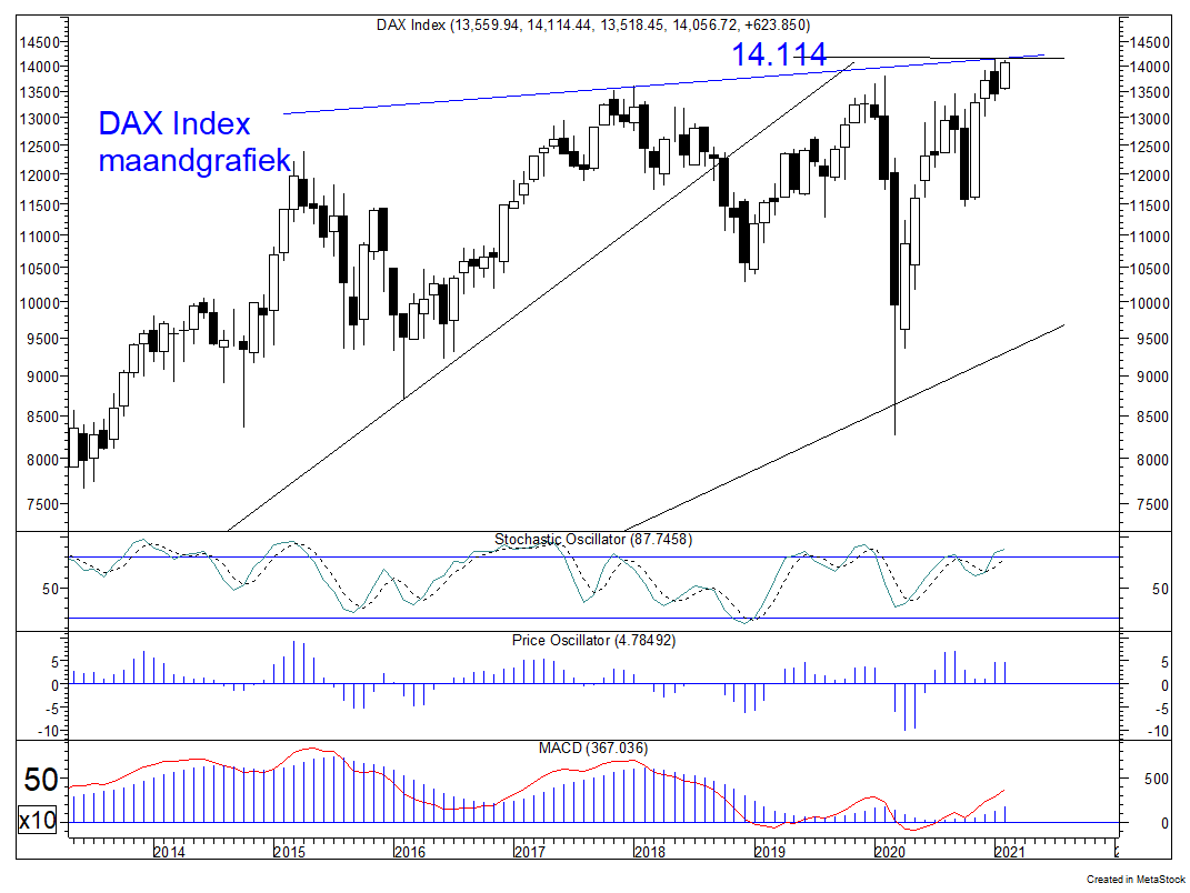 In figuur 3 vindt u de DAX IndexEen gemiddelde van de 30 meest verhandelde en grootste aandelen van de Duitse beurs. Copyright Vladeracken met zijn maandkoersen Uitgaande van de gedachte, zoals wij die hierboven beschreven, mag u niet verwachten dat de koers van de DAX IndexEen gemiddelde van de 30 meest verhandelde en grootste aandelen van de Duitse beurs. Copyright Vladeracken in de komende (zeg) twee maanden wezenlijk boven 14.114 uit zal komen. In de figuur is te zien dat de indicatoren allemaal stijgende zijn. Dit zal, als wij correct zijn ook zo blijven gedurende de komende periode, en dat houdt wel in dat er geen grote dalingen zullen optreden in het koersniveau. Of andersom gezegd: er gaan geen grote dalingen optreden en daarom zullen de indicatoren stijgende blijven. Zolang wij geen redenen hebben om aan de tweede uitleg te twijfelen houden wij het daarop. Maar er zijn ook fundamentele redenen waarom dat zo zou zijn. Hierboven hebben wij deze al genoemd. Het zijn de enorme hoeveelheid aan liquide middelen, die de markt overstroomt met de daarbij behorende lage rentestand. Maar er is ook het mogelijke idee dat men Corona onder de knie krijgt en dat zou, op termijn, een fors herstel van de economie ten gevolge hebben. In deze gedachte zou het een zwarte zwaan zijn als de vaccinatieprogramma’s in de wereld er niet in zouden slagen om de nieuwere varianten van het virus te bedwingen. Wij zijn dus niet negatief maar de kortere termijn zal ons weinig profijt opleveren. Grote verliezen worden door ons echter niet voorzien.