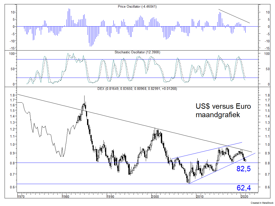 Onze visie over de US$ is al jaren lang dezelfde: ten opzichte van de € is de $ een zwakke munt. Natuurlijk, in tijden van (geo)politieke onzekerheid vluchten beleggers naar de $. Maar het nieuwe ondersteuningspakket van President Biden bevestigt het Amerikaanse principe, dat je de interne economie telkens weer kunt stimuleren door $’s erbij te drukken. Dit proces is een lange termijn sluimerend proces, dat de intrinsieke waarde van de $ structureel ondermijnt. En de nieuwe president is in deze traditie geen uitzondering. Onder president Trump zakte de $ vorig jaar al door een belangrijke lange termijn steun, de onderste blauwe oplopende lijn rechts in de figuur, waarna de daaronder liggende voorgaande bodemDieptepunt in de koersontwikkeling. Men onderscheidt onder andere de dubbele, de triple, de broadening, de V en de extended bodem. Eén van de manieren om de aanwezigheid van een bodem vast te stellen is de volgende regel: iedere koers welke voorafgegaan wordt door drie hogere en gevolgd wordt door twee hogere slotkoersen, kan beschouwd worden als een bodem. Copyright Vladeracken geraakt werd, die op 82,5 ligt. Die bodemDieptepunt in de koersontwikkeling. Men onderscheidt onder andere de dubbele, de triple, de broadening, de V en de extended bodem. Eén van de manieren om de aanwezigheid van een bodem vast te stellen is de volgende regel: iedere koers welke voorafgegaan wordt door drie hogere en gevolgd wordt door twee hogere slotkoersen, kan beschouwd worden als een bodem. Copyright Vladeracken is nu een steun gebleken waarna de koers opveerde tot aan de oplopende trendlijn, die eerder was gebroken. Een klassieke pullback. Het is slechts een logische adempauze vooraleer de daling weer wordt hervat. En dat die trendDe richting van de markt. Een opwaartse trend wordt gekarakteriseerd door een opeenvolging van hogere bodems en hogere toppen. Een neerwaartse trend wordt gekarakteriseerd door een opeenvolging van lagere bodems en lagere toppen. Copyright Vladeracken hervat gaat worden bleek afgelopen vrijdag, toen de koers met een bearish engulfingZie Engulfing patroon. Thomas Bulkowski stelde vast dat deze candlestickEen manier om koersen in een grafiek te tekenen. Hierbij worden de hoogste en de laagste koers verbonden door een rechte lijn en worden horizontaal op deze lijn de openingskoers en de slotkoers getekend. Deze laatste twee worden vervolgens verbonden door een verticale balk breder dan de eerst getekende lijn. De balk ook wel body of lichaam genoemd, is gearceerd of zwart wanneer de openingskoers onder de slotkoers ligt. De balk is open wanneer de openingskoers boven de slotkoers ligt. De dunne lijnen die boven en onder het lichaam kunnen uitsteken worden shadow of schaduw genoemd. Copyright Vladeracken in een uptrend in 79% van de gevallen waarin hij voorkwam, op correcte wijze een bearish reversal aankondigde. Hiermede bestempelt hij het als het beste omkeerpatroon in een bullmarkt. Thomas N. Bulkowski zet dit patroon op de derde plaats van de acht meest betrouwbare candlestickEen manier om koersen in een grafiek te tekenen. Hierbij worden de hoogste en de laagste koers verbonden door een rechte lijn en worden horizontaal op deze lijn de openingskoers en de slotkoers getekend. Deze laatste twee worden vervolgens verbonden door een verticale balk breder dan de eerst getekende lijn. De balk ook wel body of lichaam genoemd, is gearceerd of zwart wanneer de openingskoers onder de slotkoers ligt. De balk is open wanneer de openingskoers boven de slotkoers ligt. De dunne lijnen die boven en onder het lichaam kunnen uitsteken worden shadow of schaduw genoemd. Copyright Vladeracken patronen. Copyright Vladeracken candle de weg omlaag weer insloeg. 82,5 moet nog steeds worden gebroken, maar wij gaan er vanuit, dat dit slechts een kwestie van tijd is. Ons volgende doel ligt op 62,4, de bodemDieptepunt in de koersontwikkeling. Men onderscheidt onder andere de dubbele, de triple, de broadening, de V en de extended bodem. Eén van de manieren om de aanwezigheid van een bodem vast te stellen is de volgende regel: iedere koers welke voorafgegaan wordt door drie hogere en gevolgd wordt door twee hogere slotkoersen, kan beschouwd worden als een bodem. Copyright Vladeracken die in 2008 werd bereikt. Vakantie vieren in de VS wordt weer spotgoedkoop, maar exporteren naar de VS gaat veel duurder worden.